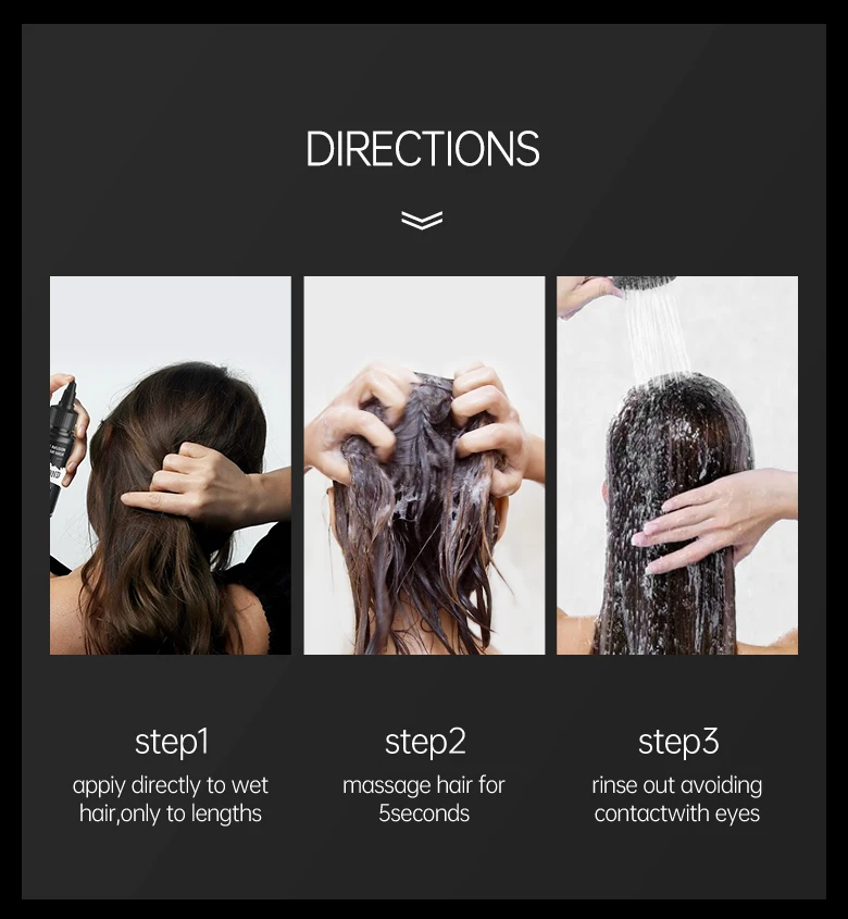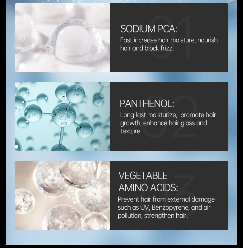 Для решения проблем с волосами, вызванных нехваткой воды, такой как вьющиеся волосы и разделенный конец, эта маска для волос специально добавляется растительный экстракт для увлажнения волос. Каждая капля этой маски для волос обертывает супер увлажняющую молекулу, которая может попасть в кутикулу волос и непосредственно питает волосы. Нанесение на волосы в течение 5 секунд с прорывным лечением волос, трансформирует шелковистые, более здоровые волосы, которые видны для первого использования.