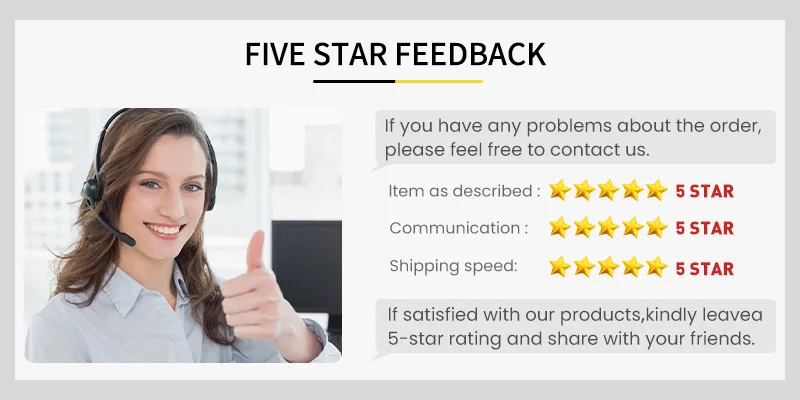 1. Ваше подтверждение будет высоко оценено после получения товаров. Как только вы получили товар, надеемся, что вы оставите нам положительный отзывы (5 звезд).
