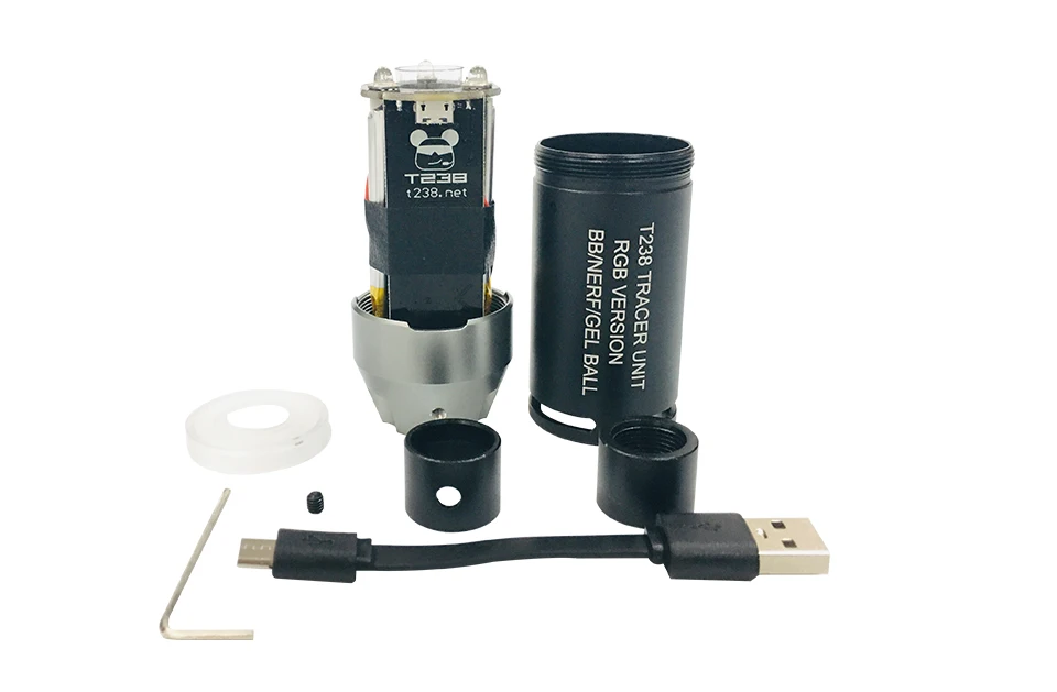 T238 tracer блок предназначен для BB/NERF Дротика/гелевых шариковых бластеров, он прикрепляется к вашему бластеру, которые позволяют вашему BB/NERF Дротика/гелевый шарик светится в темноте. Чтобы увидеть путь полета вашего снимка, нужны специальные дартс/гелевые шарики tracer BBs/NERF. При использовании RGB версии, вы все еще можете увидеть радугу огневого эффекта без помощи специальных пуль.