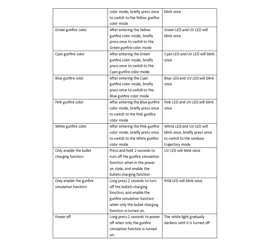 Функции: режим Rainbow tracer, динамический цвет gunfire, tracer BBs/NERF дартс/гелевые шарики для зарядки, регулируемый цвет gunfire, автоматическое отключение 20 минут, автоматическое отключение низкого заряда батареи