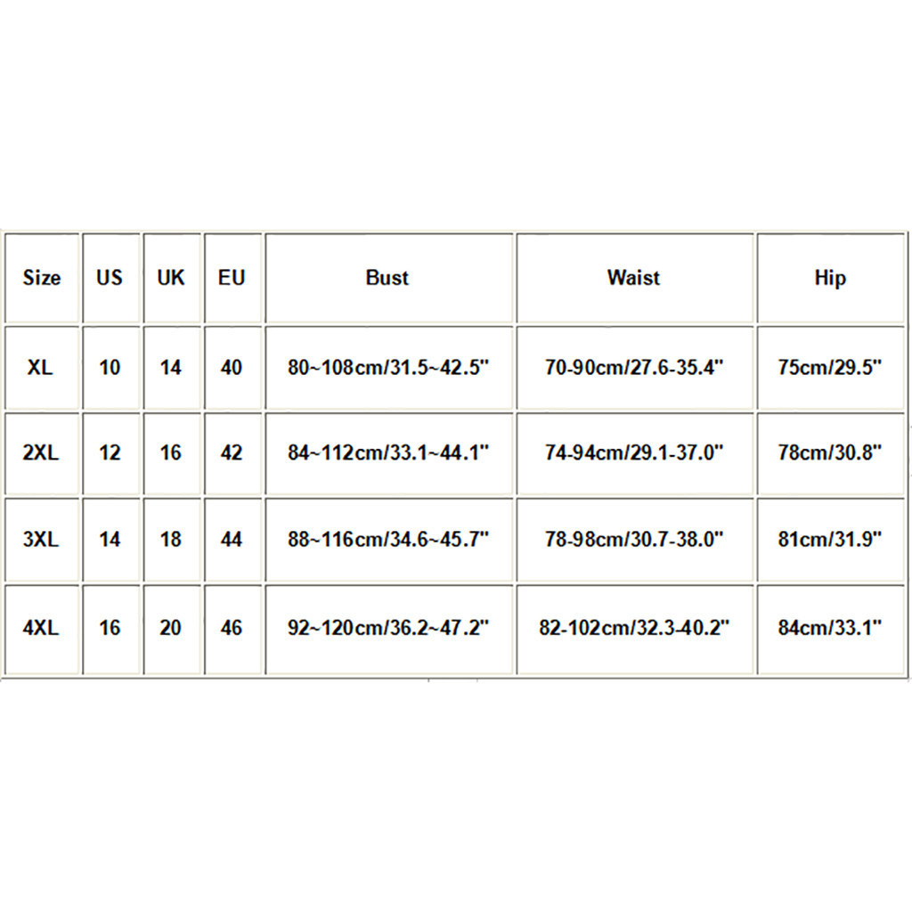 Размеры США Великобритания ЕС Бюст Талия Бедра XL 10 14 40 80 ~ 108 см/31,5 ~ 42,5" 70-90 см/27,6-35,4" 75 см/29,5" 2XL 12 16 42 84 ~ 112 см/33,1 ~ 44,1" 74-94 см/29,1-37,0" 78 см/30,8" 3XL 14 18 44 88 ~ 116 см/34,6 ~ 45,7" 78-98 см/30,7-38,0" 81 см/31,9" 4XL 16 20 46 92 ~ 120 см/36,2 ~ 47,2" 82-102 см/32,3-40,2" 84 см/33,1"