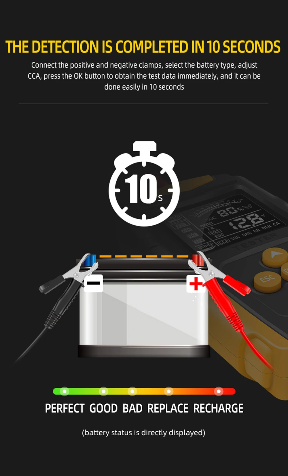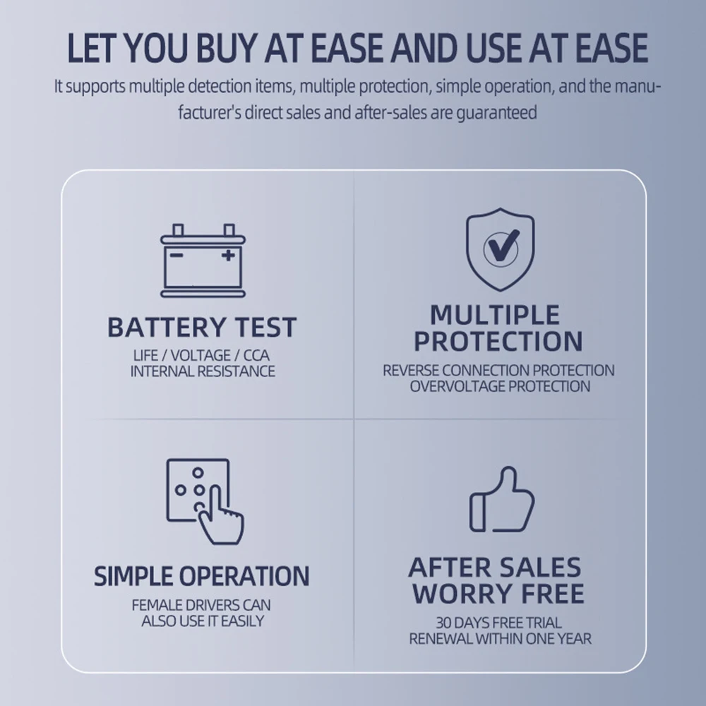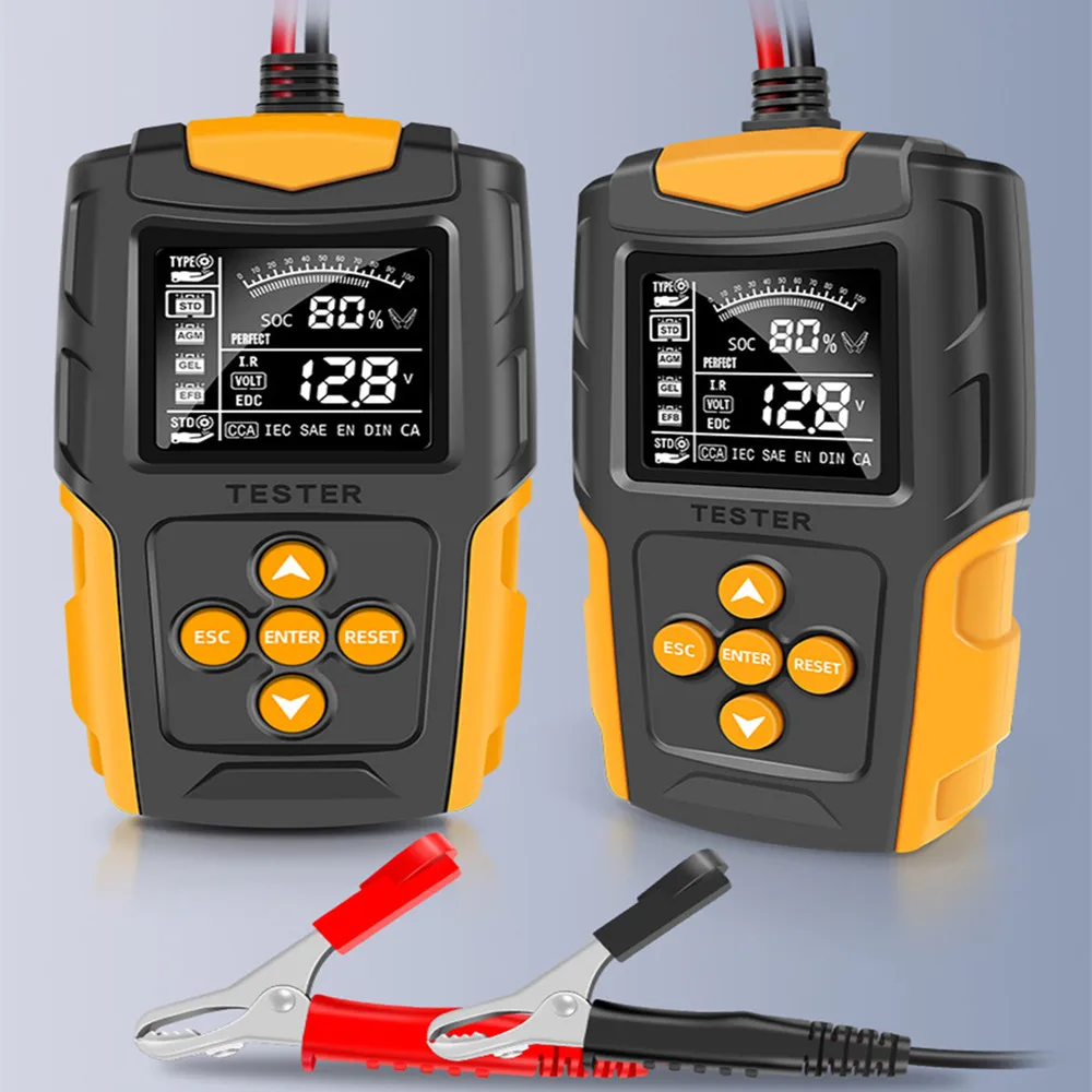 This digital Battery tester is designed to test the condition of the automotive battery by applying resistance load to it and obtain the result from the Automobile facory, garage, auto battery manufacturer, auto battery agent, educational institution, DIY enthusiasts; this analyzer utilizes a series of pulsed voltage across the battery cells and observes the AC current that flows in response to it. and it can suitable for 12V 24V lead acid batteries, hardtop batteries, discharge batteries and maintenance free batteries heavy duty insulated clamps.
