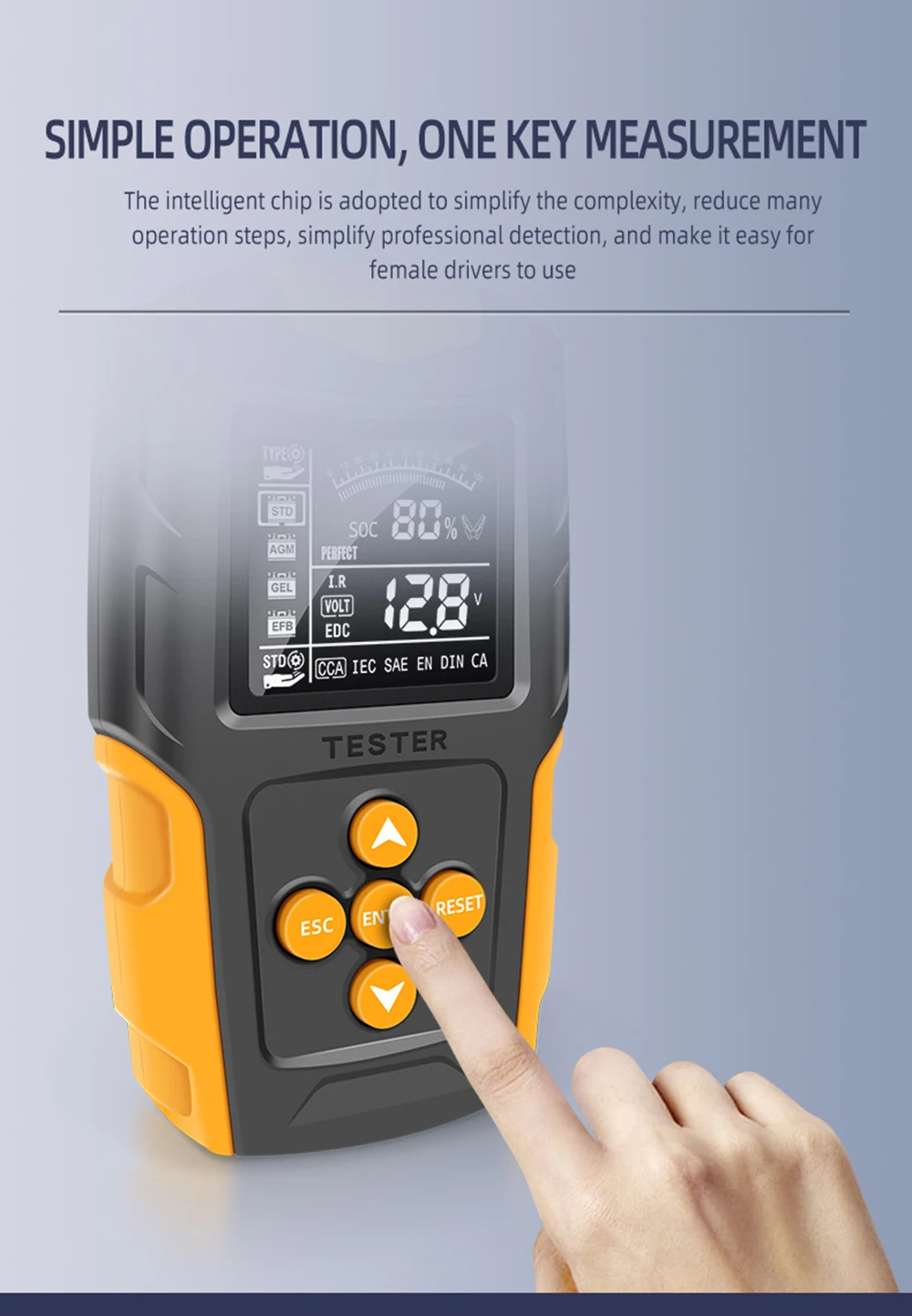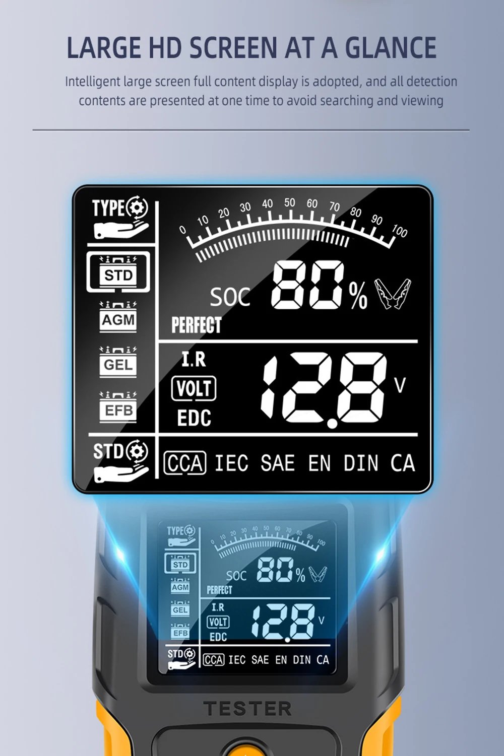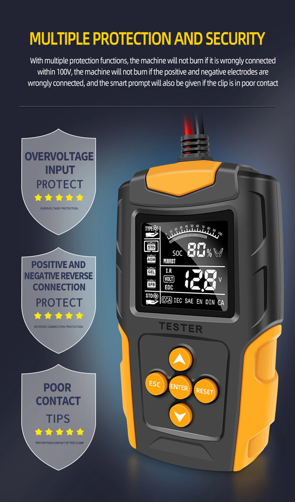 This digital Battery tester is designed to test the condition of the automotive battery by applying resistance load to it and obtain the result from the Automobile facory, garage, auto battery manufacturer, auto battery agent, educational institution, DIY enthusiasts; this analyzer utilizes a series of pulsed voltage across the battery cells and observes the AC current that flows in response to it. and it can suitable for 12V 24V lead acid batteries, hardtop batteries, discharge batteries and maintenance free batteries heavy duty insulated clamps.