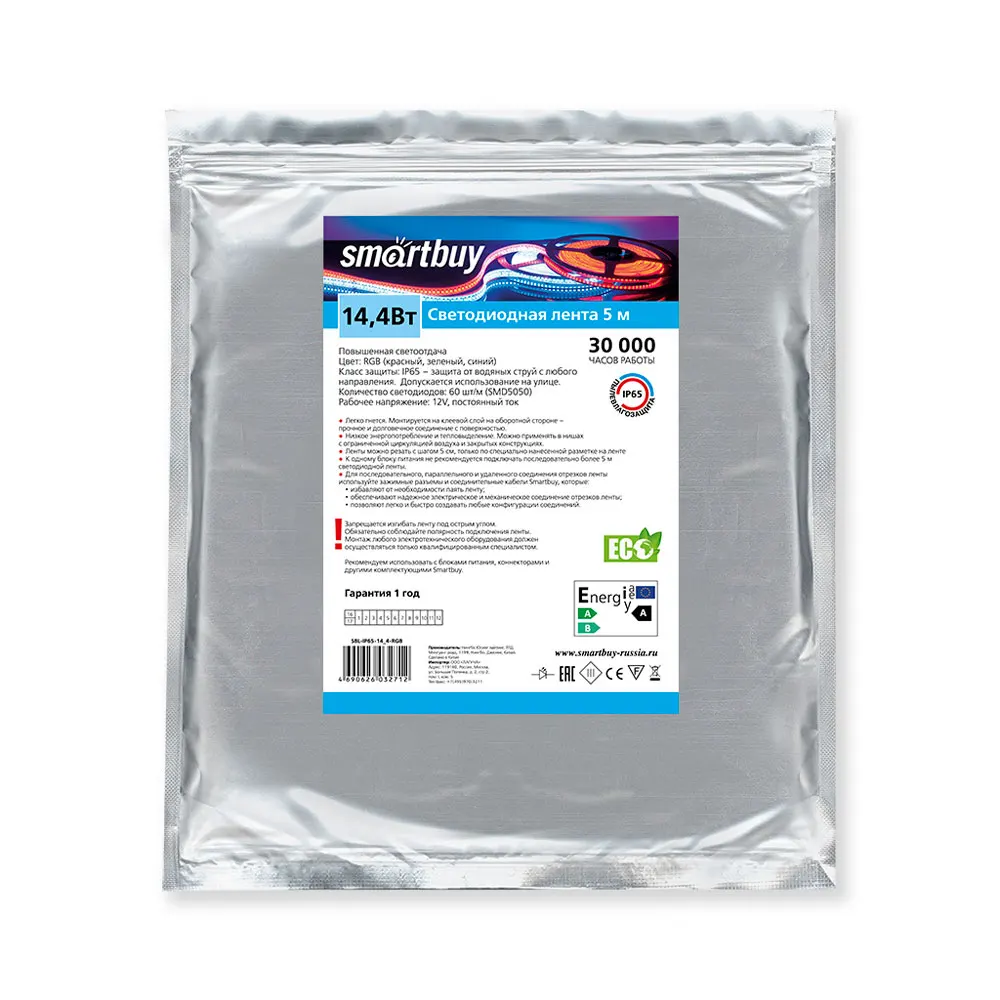 Светодиодная лента 12 вольт, SMD 5050 60LED Smartbuy-IP65-14.4W RGB SBL-IP65-14_4-RGB изготовлена из светодиодов Epistar в корпусе 5050. Лента выпускается на гибкой печатной плате белого цвета шириной 8 мм и поставляется в катушках по 5 метров. Каждая катушка с лентой укомплектована проводами для подключения к источнику питания. Эффективность светодиодной ленты более 70 лм/ Вт. Срок службы светодиодной ленты Smartbuy составляет 30 000 часов. Гарантийный срок эксплуатации – 12 месяцев.