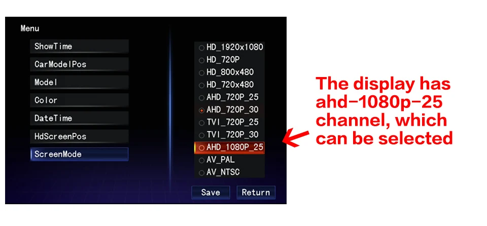 Перейдите к настройкам автомобиля> заводские настройки> Настройки обратного хода (изображение)> Выберите AHD 1080P 25