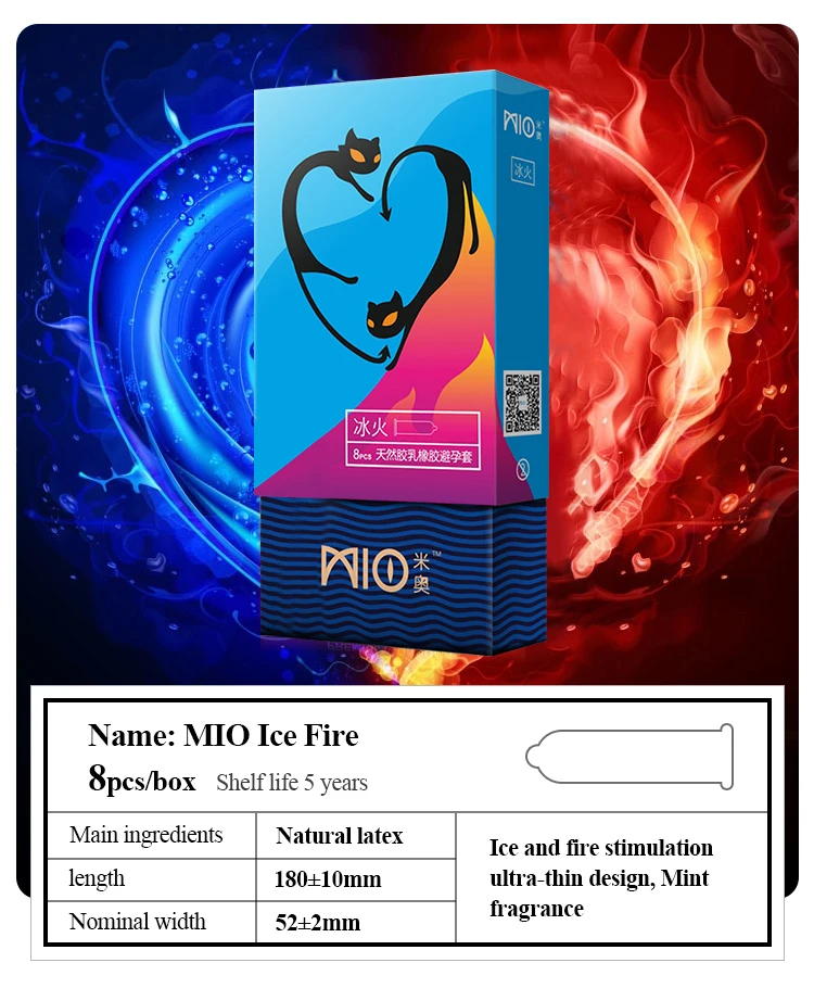 2.Ice Fire 8 pcs(52mm):Smooth condom, including two styles of ice and heat, Ice and fire stimulation, moderately lubricated, Mint fragrance.