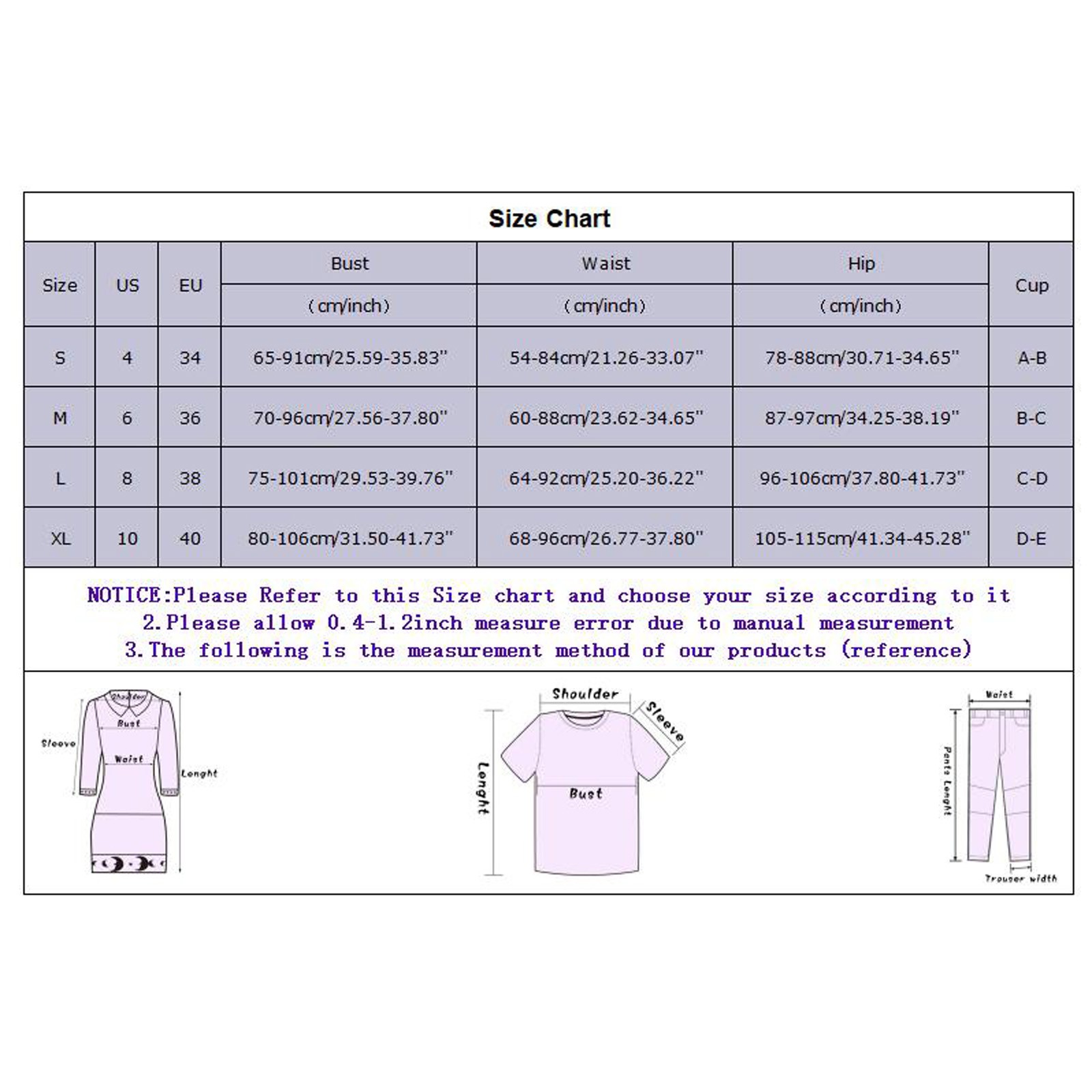 Размеры США ЕС Бюст Талия Бедра Чашка S 4 34 65-91 см/25,59-35,83'' 54-84 см/21,26-33,07'' 78-88 см/30,71-34,65'' A/B М 6 36 70-96 см/27,56-37,80'' 60-88 см/23,62-34,65'' 87-97 см/34,25-38,19'' B/C L 8 38 75-101 см/29,53-39,76'' 64-92 см/25,20-36,22 дюйма 96-106 см/37,80-41,73'' C/D XL 10 40 80-106 см/31,50-41,73'' 68-96 см/26,77-37,80'' 105-115 см/41,34-45,28'' D/E