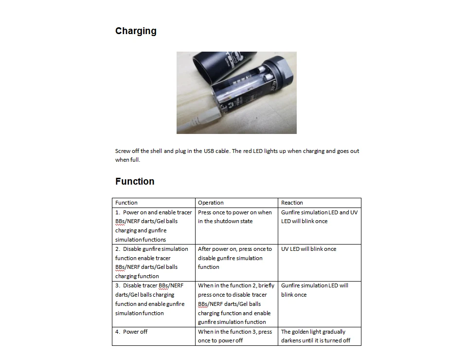 Functions: tracer BBs/NERF darts/Gel balls charging, gunfire simulation, 20 minute timeout automatic shutdown, low battery automatic shutdown