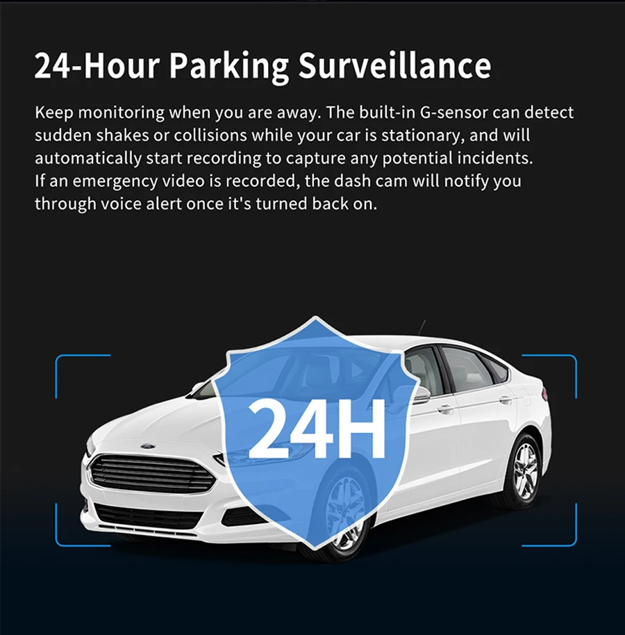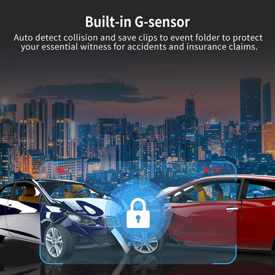 Продолжайте следить, когда вас нет. Встроенный g-сенсор может обнаруживать внезапные тряски или столкновения, когда ваш автомобиль находится в неподвижном положении, и автоматически начнет запись, чтобы запечатлеть любой потенциальный случайный случай, записывается аварийное видео, видеорегистратор уведомит вас о голосовом оповещении при включении.