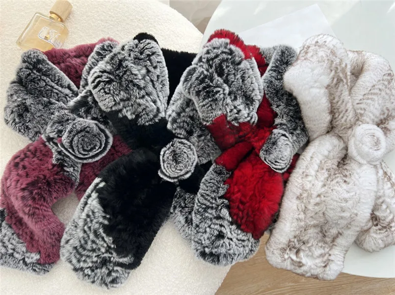 Настоящий мех кролика шарф женский зимний теплый пушистый воротник вязаные шарфы с розой оптовая цена