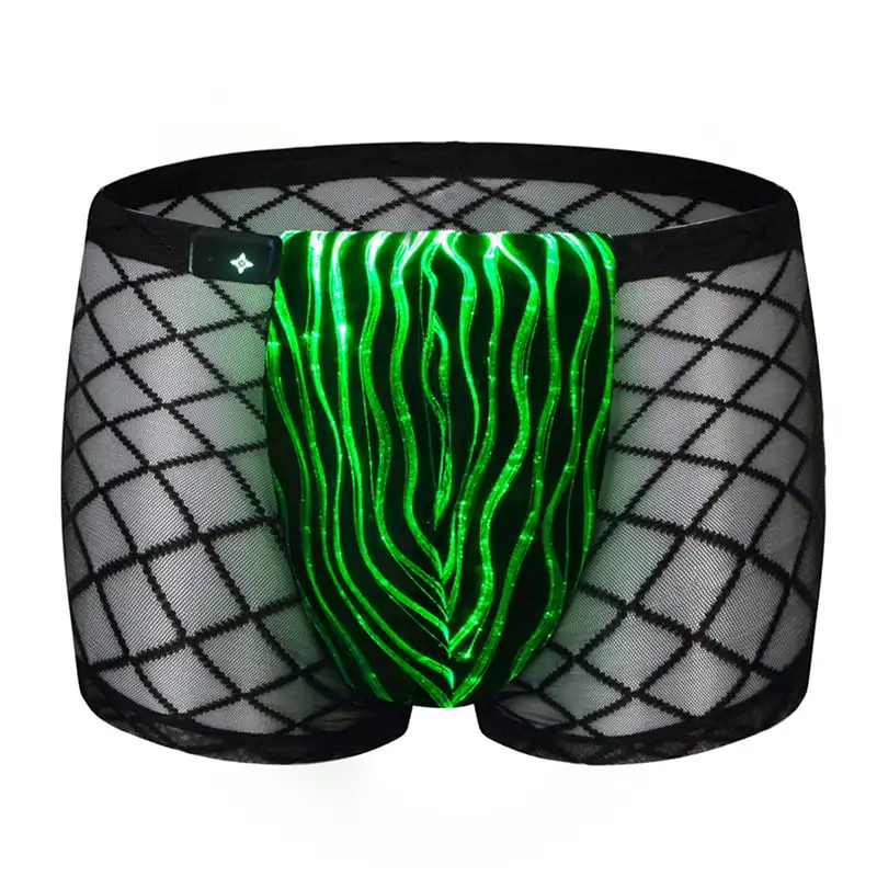 Светодиодный светильник передает цвет оптическому волокну, в результате чего сексуальные трусы-боксеры светятся и меняют цвет.