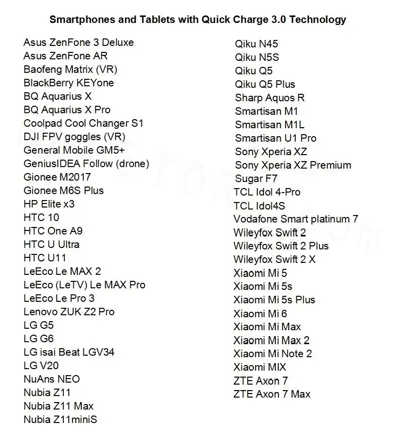 USB QC3.0: 3,6 V-6,5 V/3A, 6,5 V-9V/2A, 9-12 В/1.5A