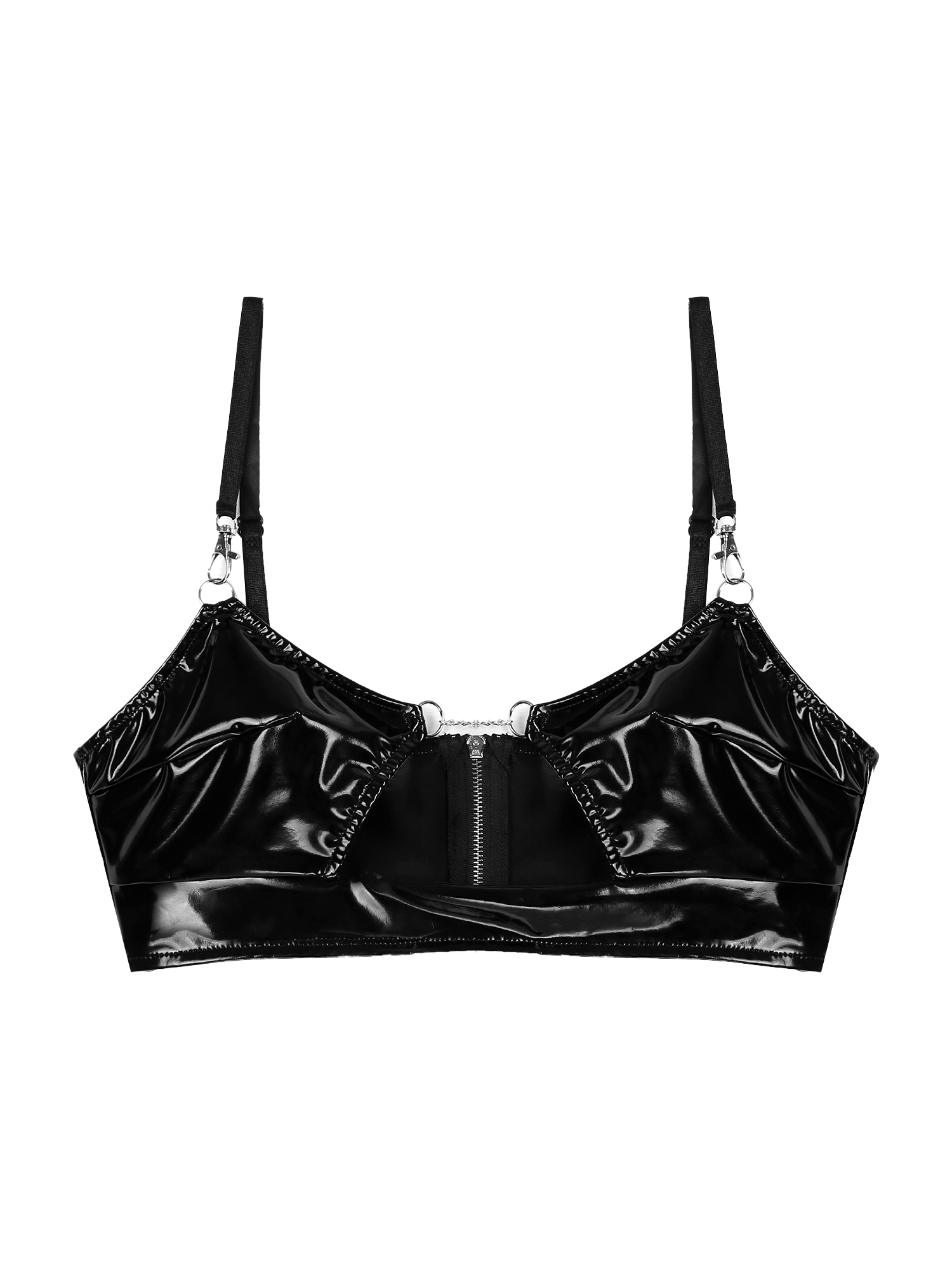 Женский укороченный топ из лакированной кожи без рукавов с вырезами и регулируемыми лямками на молнии.