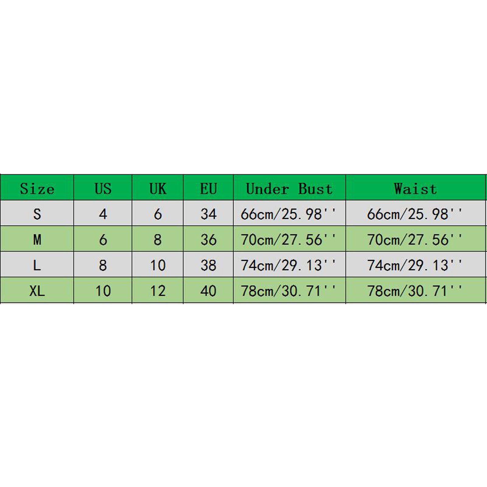 Размеры Американский размер Размер Великобритании Европейский размер Под грудью Талия S 4 8 34 66 см/25,98'' 66 см/25,98'' М 6 10 36 70 см/27,56'' 70 см/27,56'' L 8 12 38 74 см/29,13'' 74 см/29,13'' XL 10 14 40 78 см/30,71'' 78 см/30,71''
