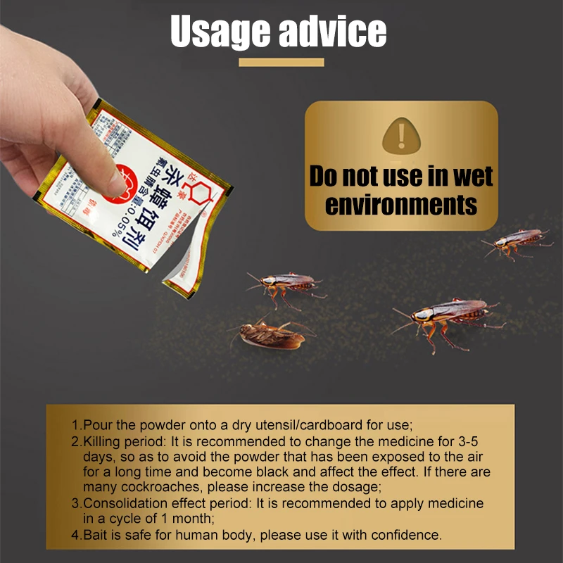Разделите 1 пакет на 3 или 4 части и поместите в место с тараканами. Инфекция убивает всех тараканов в течение трех дней после употребления порошка. Значительные эффекты могут длиться до трех месяцев.
