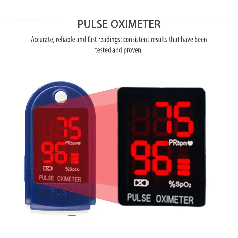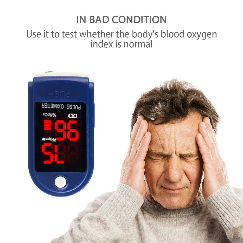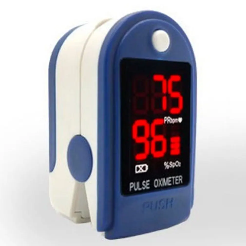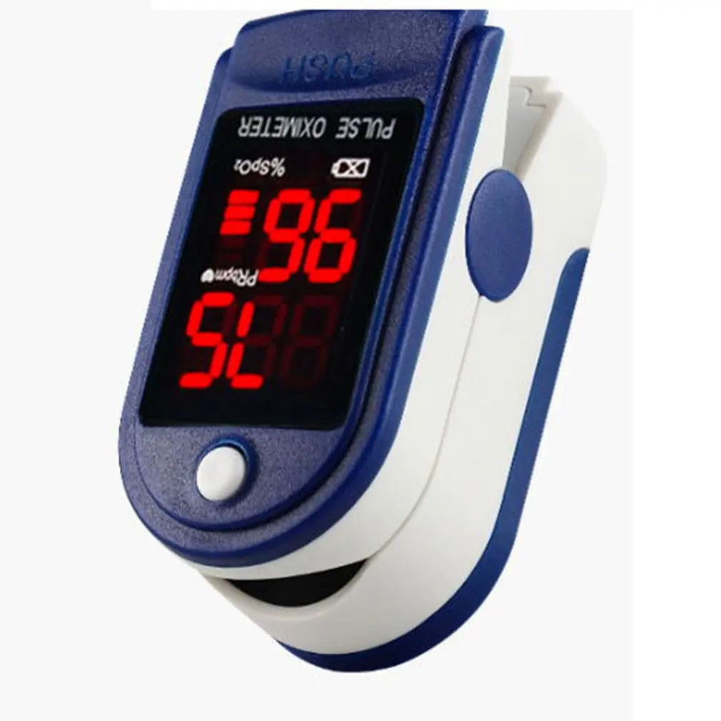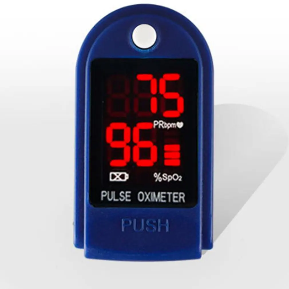 Portable finger oximeter, fingertip pulse oximeter, device with sleep monitor, low battery indicator.