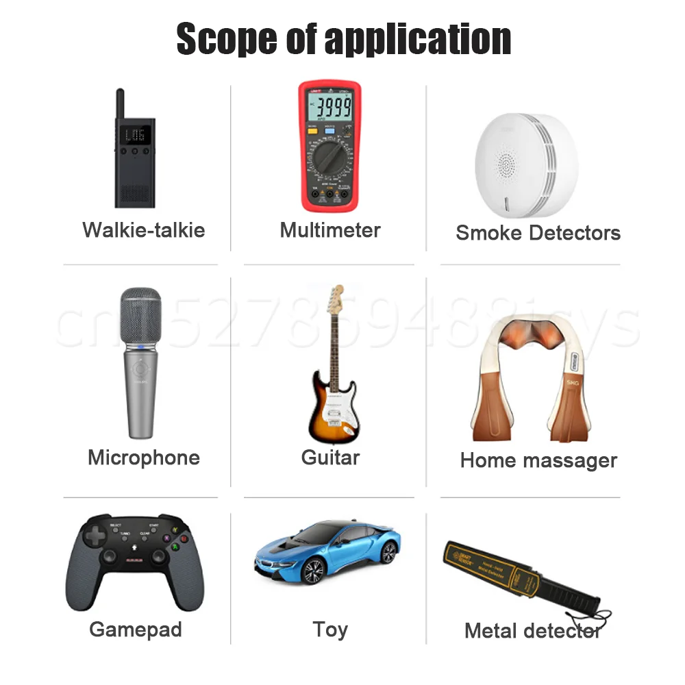 Широкий диапазон температур, подходит для беспроводного микрофона, мультиметра, дымовой сигнализации, электрогитары, рации, металлоискателя, массажера, дистанционного управления игрушками, приборов.