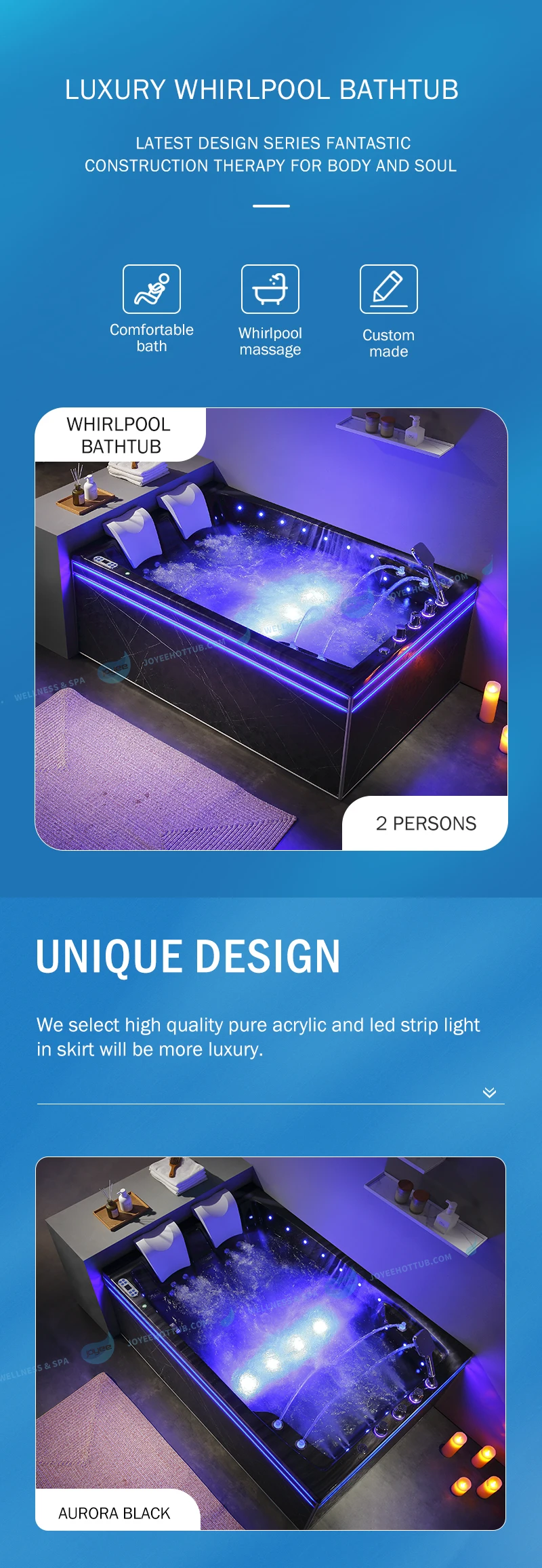 JOYEE was established in 2004 and locate in Foshan. And now we have strong manufacturing capacity and globally leading scale economies. Our market in Jacuzzi bathtub, Soaking bathtub, Outdoor spa, Steam room and Sauna. With ISO9001