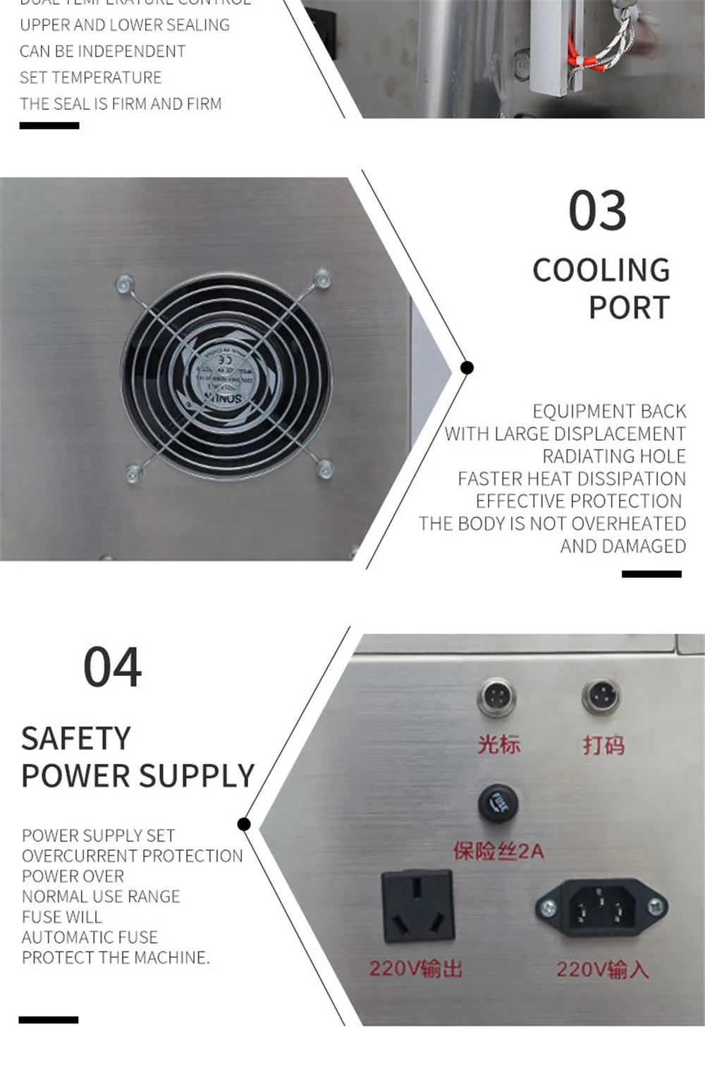 Модель: KN-ZD-YS20 Votage:220V50Hz и 110V60Hz Размеры: L52 * H42 * H160 см Область упаковки: соевый соус, уксус, молоко, напитки, соевое молоко, пищевое масло, вино, традиционная китайская медицина и т. д. Ширина сумки: 6 -20 см Ширина готового мешка: 3-10 см Эффективная длина бокового уплотнения: 1-15 см Вес упаковки: 10-200 г