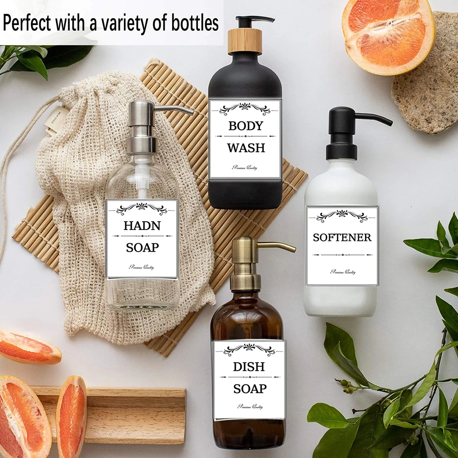 12 наклеек для стеклянных бутылок содержат все виды жидкостей, таких как мыло для посуды, шампунь, лосьон для рук, кондиционер, мыло для рук, мытье лица, мытье тела, освежитель воздуха, спрей для эфирных масел, вы не запутаете жидкости, удерживающие в бутылках. Простая наклейка обеспечивает большую организованность вашей кухни и ванной комнаты.