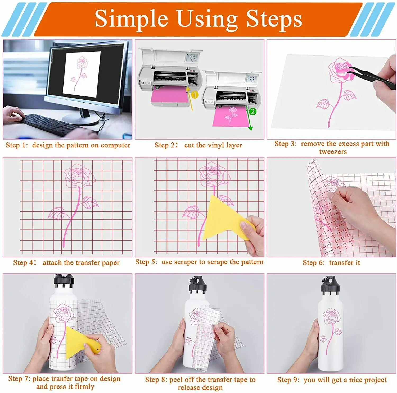 Внимание:1. Резка и прополка: перед резкой снимите прозрачную защитную пленку. Если вы не Очистите эту прозрачную пленку, винил будет трудно разрезать и сорвать.2. Не нужно зеркальный дизайн, пожалуйста, Вырежьте его напрямую.3. Для небольших узоров, пожалуйста, нажмите на деталь, которая вам нужна, чехол поднимается при прохождении прополки.