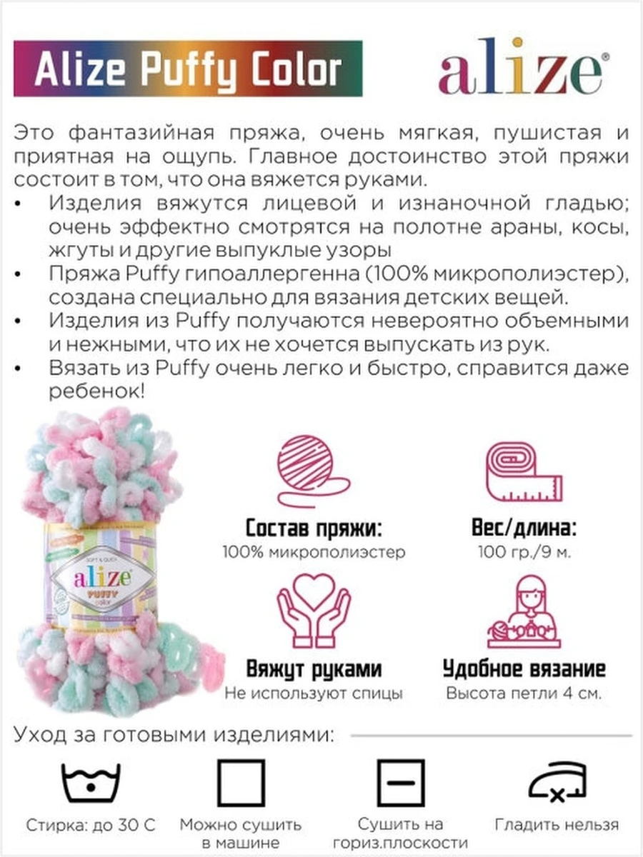 Пряжа Ализе Пуффи – плюшевая крупная нить, состоящая из петелек для работы вручную без применения спиц. Большие петли позволяют без проблем преобразить пряжу в единое полотно, создавая фантазийное изделие. Обширно используют этот материал для создания детской одежды и игрушек, ведь он очень мягкий и нежный, что особенно важно для детских принадлежностей.