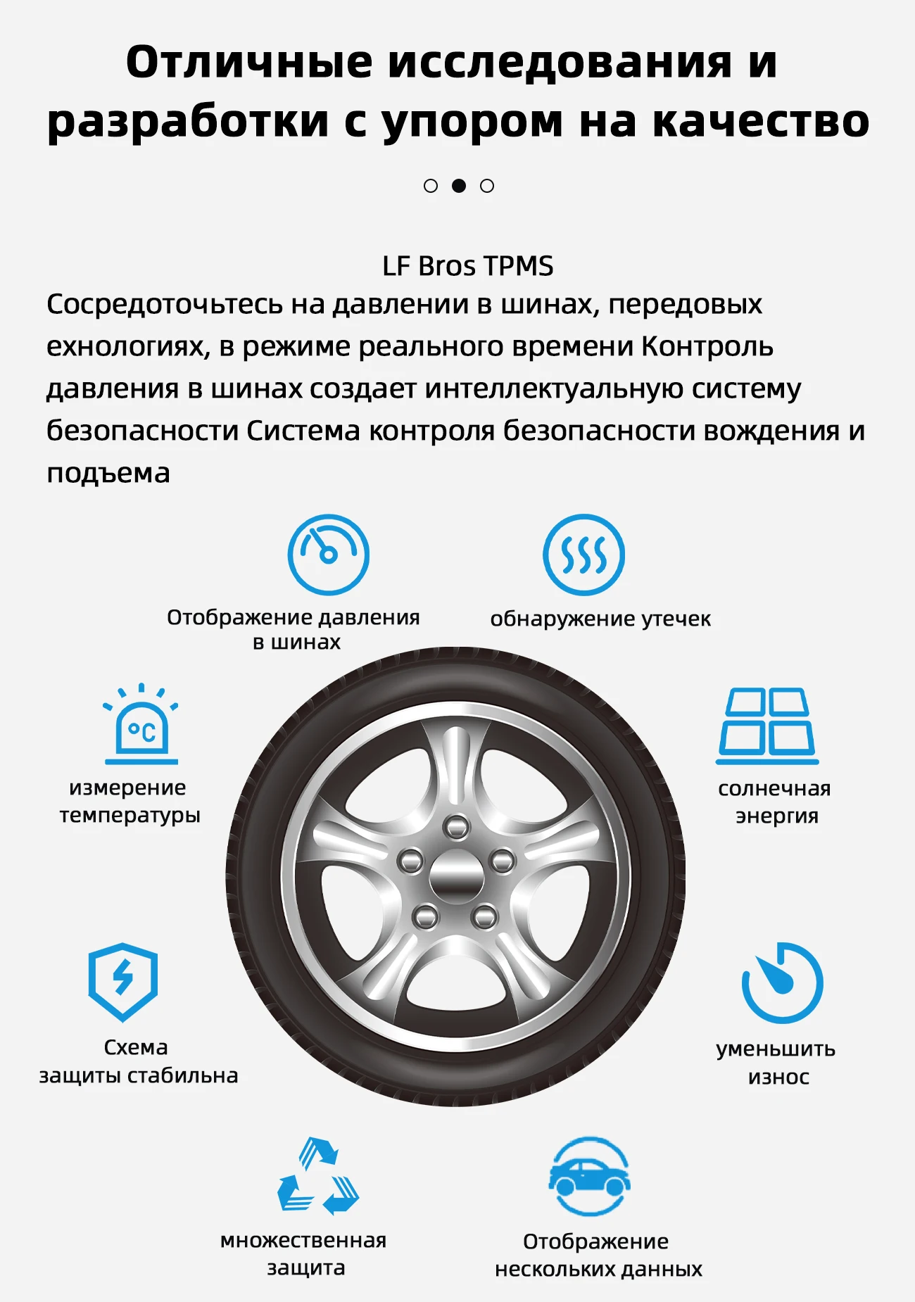 Система LF Bros TPMS позволяет определить уровень давления с погрешностью всего 0,1 бар во всех четырех шинах автомобиля. Благодаря этому сохраняется оптимальная центровка колес для вашей безопасности, идеального контроля автомобиля, эффективности расхода топлива и сокращения износа шин.