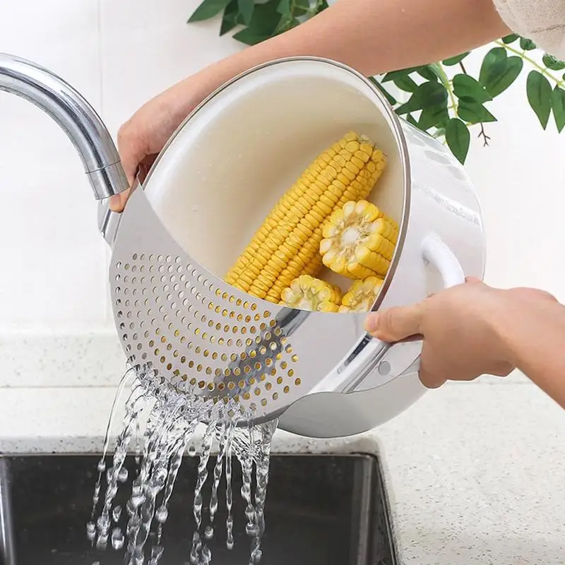 * Простота в использовании: Поместите этот фильтр для сковороды на сковороду, просто Наклоните кастрюлю, чтобы фильтровать макароны, рис и т. д., крепко удерживайте обе стороны, чтобы предотвратить ожоги рук.
