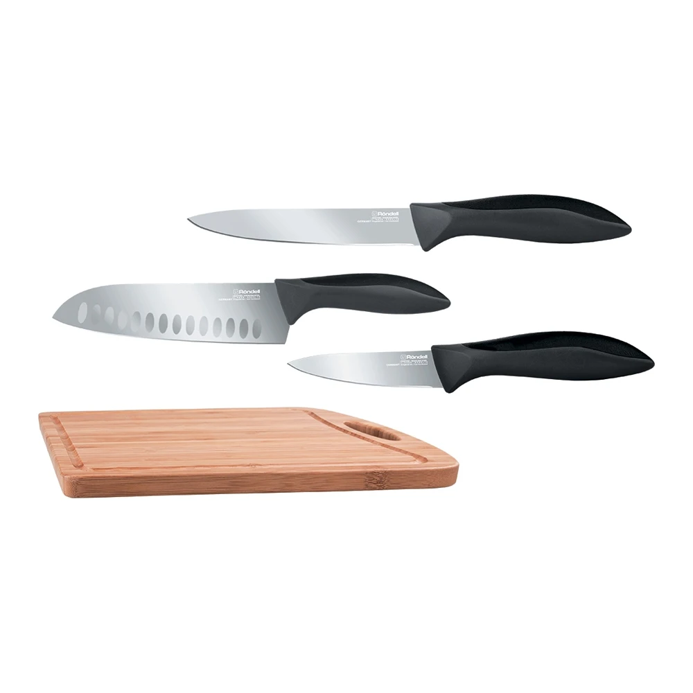 All of them are made of high-quality German stainless steel (frequent sharpening is not required!) and have comfortable plastic handles with rubberized inserts that have antibacterial properties. The set also has a convenient cutting board, which is never superfluous. And all this-at a very affordable price!