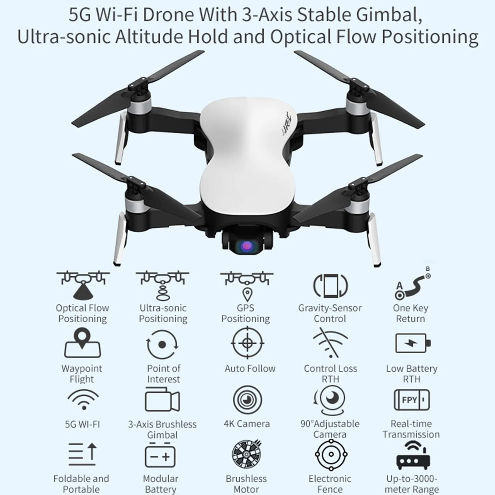 GPS Позиционирование, настройка барометра, делает полет более безопасным и достигается на открытом воздухе Фиксированная точка 5G WiFi 4K Камера высокой четкости, небольшая задержка передачи изображения, передача Расстояние около 3000 метров, дает вам уникальную аэрофотосъемку Опыт работы Пульт дистанционного управления Управление с камерой, панорамирование/регулировка угла наклона, размер и номер руля, Съемка одним касанием, посадка одним касанием, Безголовый режим, возврат одной кнопкой, Неконтролируемый возврат Объемный Интересующий вас момент, позволяя Вашему самолету вращаться по часовой стрелке вокруг Предустановленная точка Батарея Конструкция уплотнения, разумная Монтажная структура, специальная зарядная розетка, далее Увеличьте Срок службы батареи Специальный Приложение, простой интерфейс работы, возврат данных OSD покрытие и одна кнопка Разблокировка/посадка, планирование путевых точек Машина Имеет параметры безопасности, такие как защита от погружения, защита от стойла, низкий возврат, Низкая Электрическая безопасность полета электронный заборU-ltrasonic Система постоянной высоты: