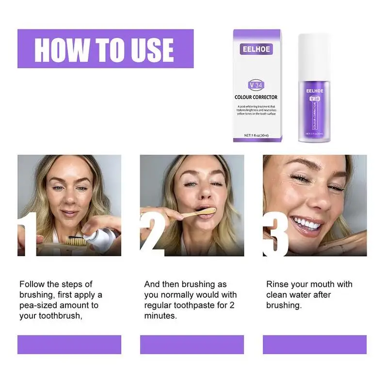3. Мы нашли идеальный темно-фиолетовый оттенок для нейтрализации желтого, новый способ очистки зубов, неинвазивное отбеливание