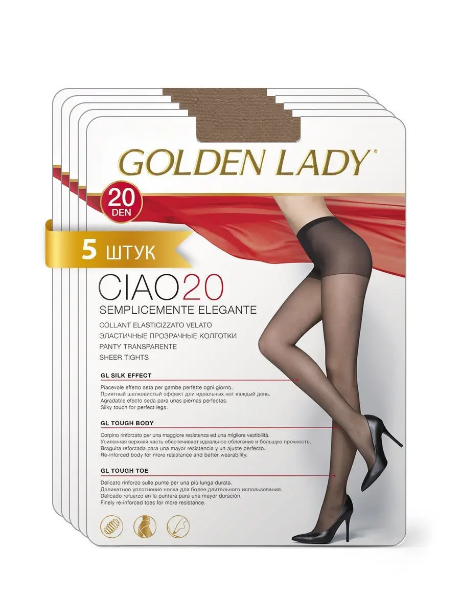 Тонкие эластичные колготки тм GOLDEN LADY CIAO 20 den с шортиками и комфортными швами. Цвета производителя: коньячный - Cognac; серый - Fumo; черный - Nero; светло-бежевый - Playa.