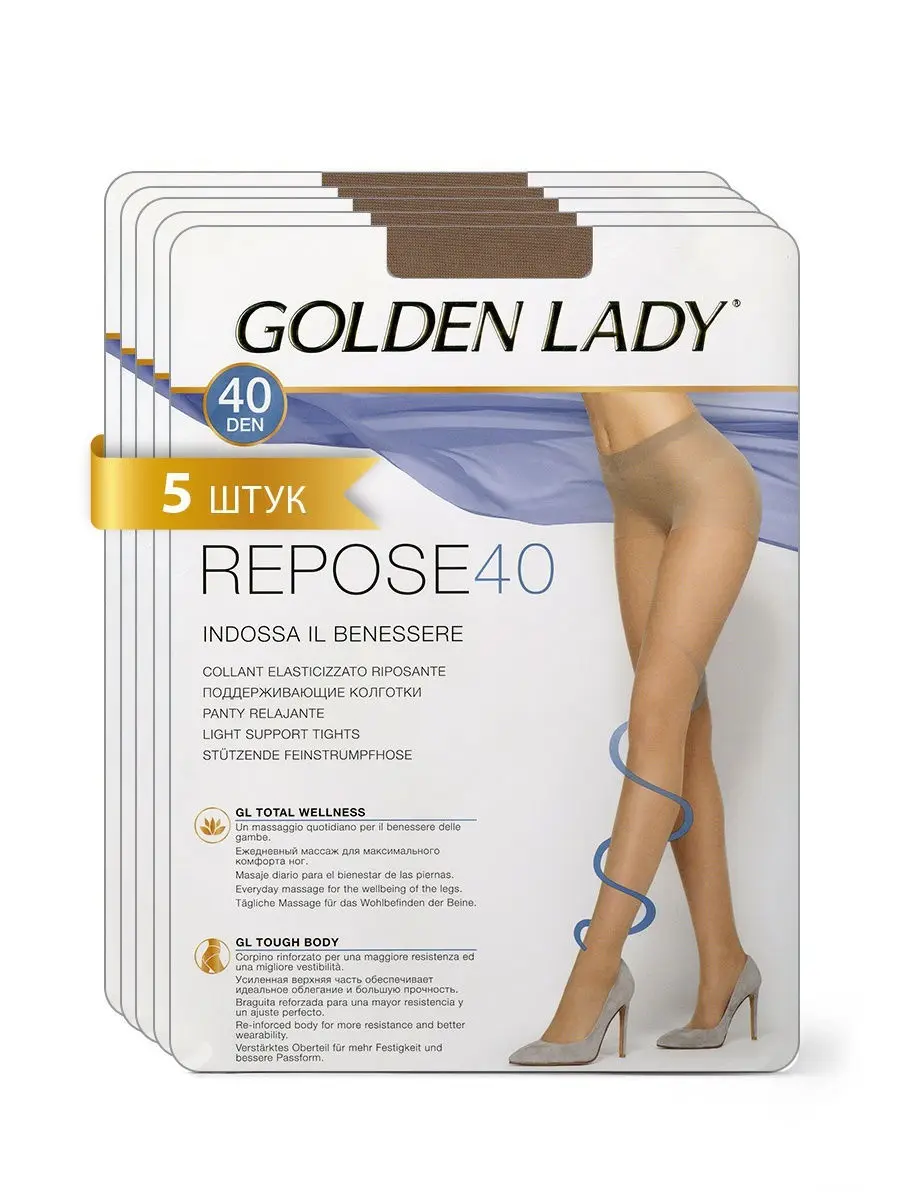Колготки женские тм GOLDEN LADY REPOSE 40 den - элегантные эластичные колготки с массажным эффектом. Усиленная верхняя часть обеспечивает превосходное облегание и большую прочность, поддерживающие шортики и комфортные швы создают дополнительный комфорт. Усиленный мысок увеличивает износостойкость и прочность. Распределенное давление по ноге оказывает легкий массажный эффект, который создает комфортное ощущение в течение всего дня и снижает усталость ног. Женские колготки тм GOLDEN LADY REPOSE 40 den смотрятся естественно, гармонично дополняют любой образ и прекрасно сочетаются с юбками, шортами и платьями.