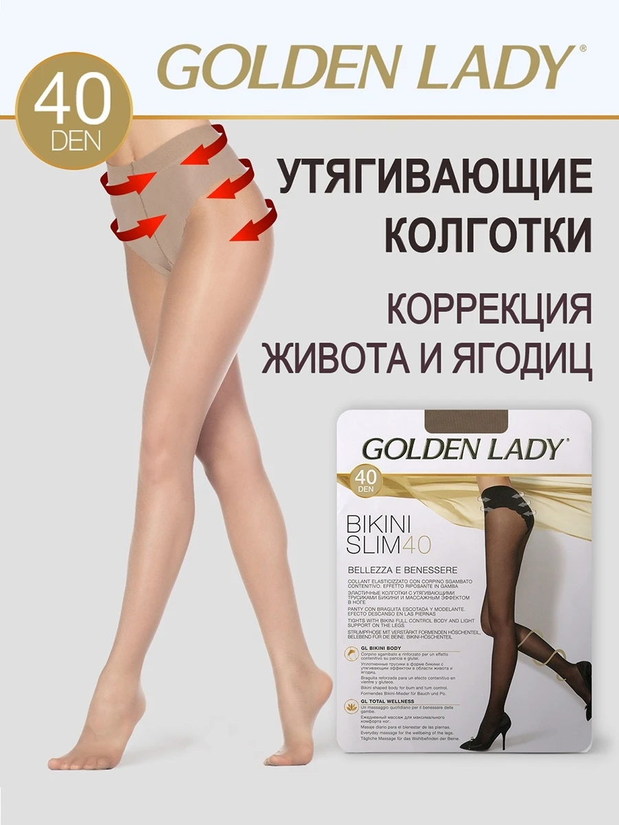 Эластичные поддерживающие колготки тм GOLDEN LADY BIKINI SLIM 40 den с утягивающим эффектом в области живота и ягодиц, массажным эффектом по ноге. Трусики бикини, гигиеничная ластовица, комфортные швы.