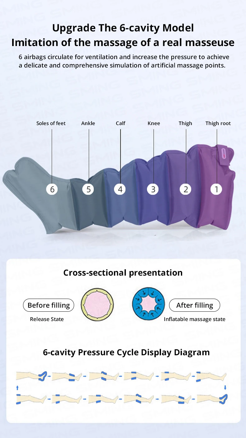 Метод Воздушного Массажа заключается в том, что воздушная подушка надувается и сдувается один за другим от дистального конца конечности до проксимального конца (от стопы до бедра, от руки до руки).