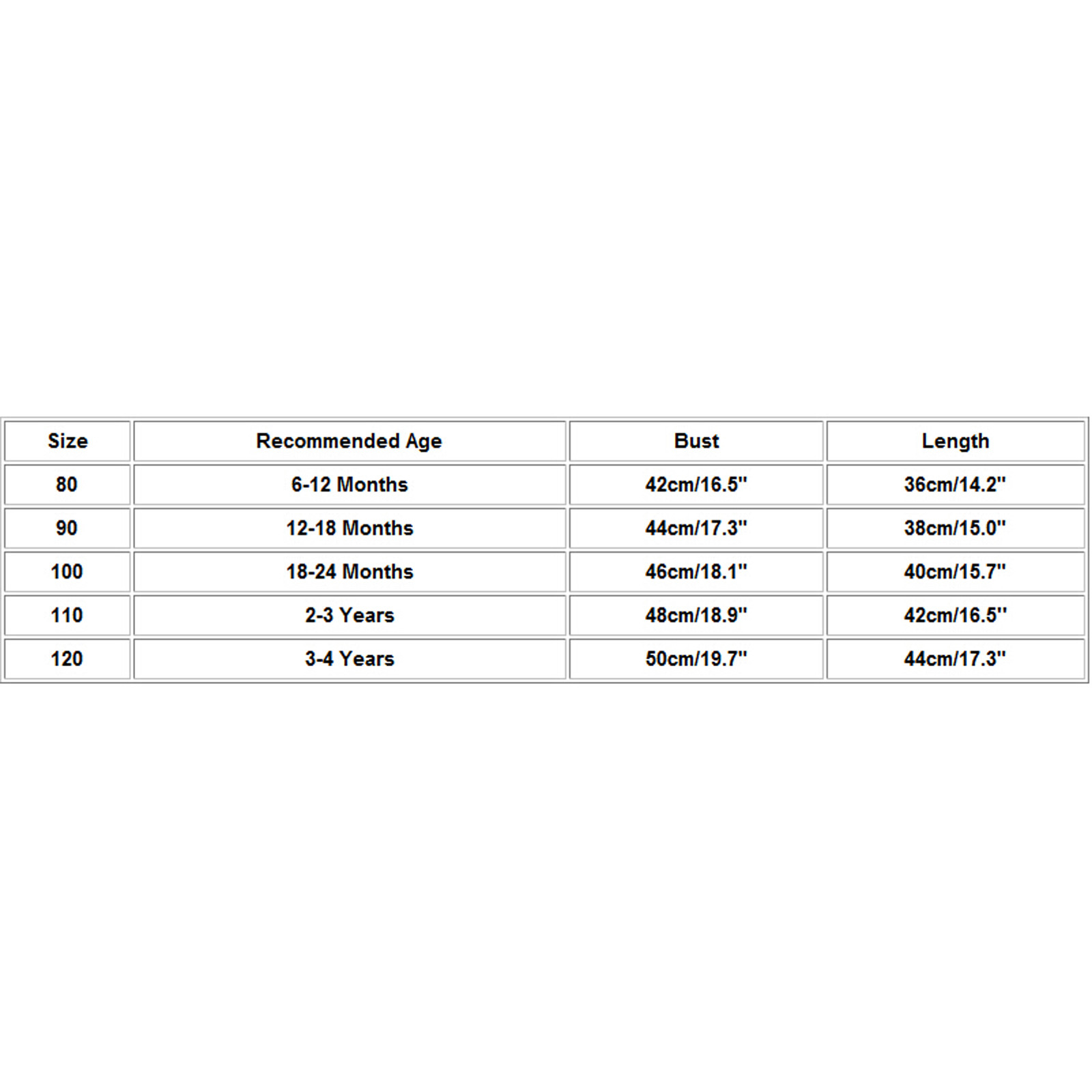 Размеры Рекомендуемый возраст Бюст Длина 80 6-12 месяцев 42 см/16,5" 36 см/14,2" 90 12-18 месяцев 44 см/17,3" 38 см/15,0" 100 18-24 месяцев 46 см/18,1" 40 см/15,7" 110 От 2 до 3 лет 48 см/18,9" 42 см/16,5'' 120 От 3 до 4 лет 50 см/19,7" 44 см/17,3"