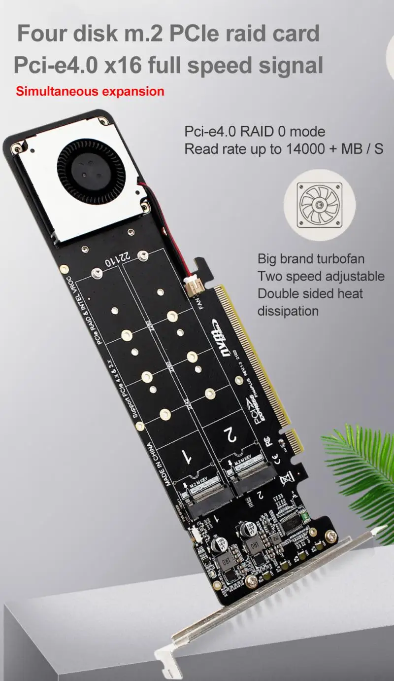 Он поддерживает четыре полноканальные NVME SSD и M.2 PCI-E устройства интерфейса X4, а материнская плата поддерживает функции PCI-E split или PCI-E RAID.