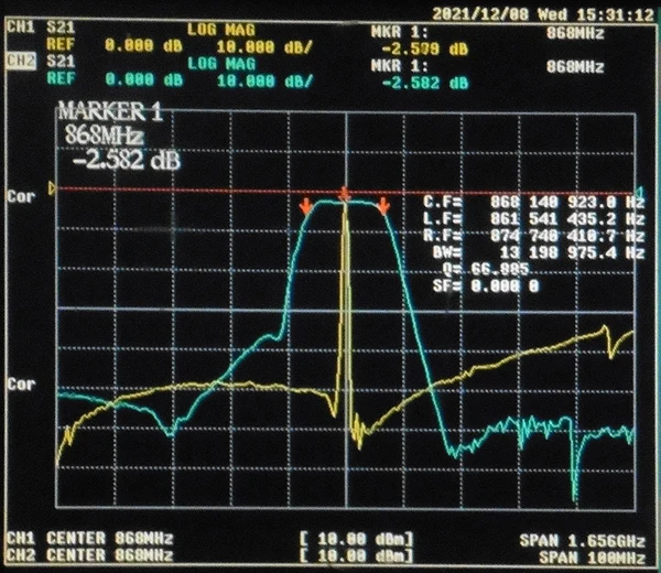 Диаграмма частотного отклика (отмечена как полоса пропускания 3 дБ, Центральная частота развертки: 868 МГц, синяя линия пролета: 100 МГц, вертикальная шкала: 10 дБ на деление)