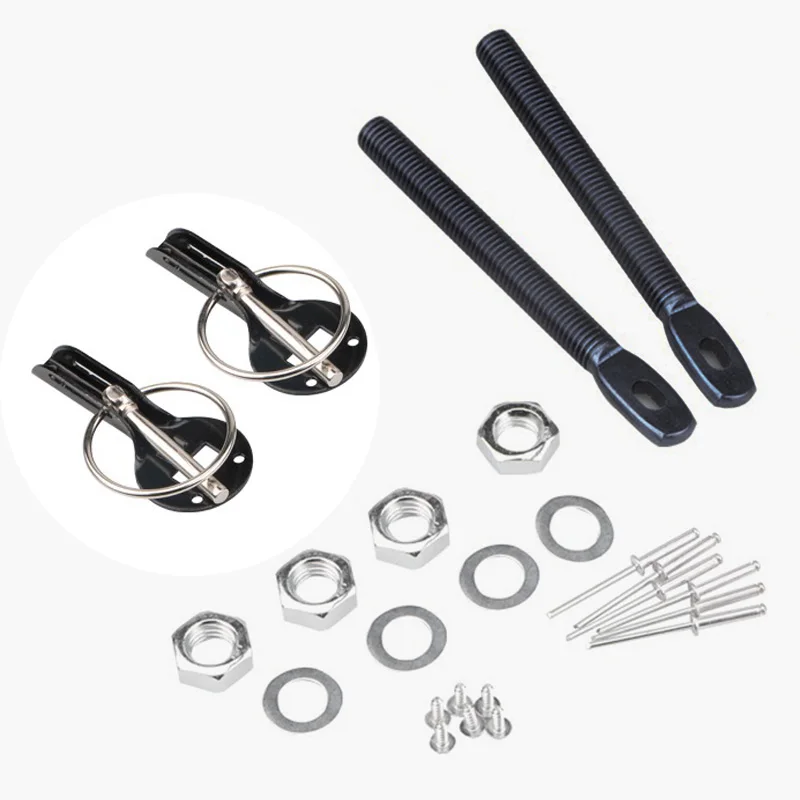 Держатель для замка капота, универсальный фиксатор для капота, фиксатор для крепления на капоте, фиксатор для фиксатора, комплект для гоночного автомобиля Установка буренияВсе аксессуары включены для установки, сверление требуется для правильного крепления штифтов к капоту.