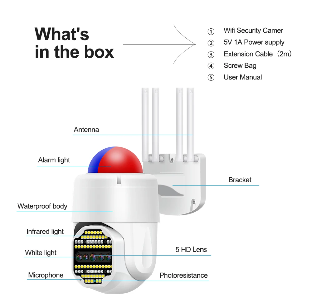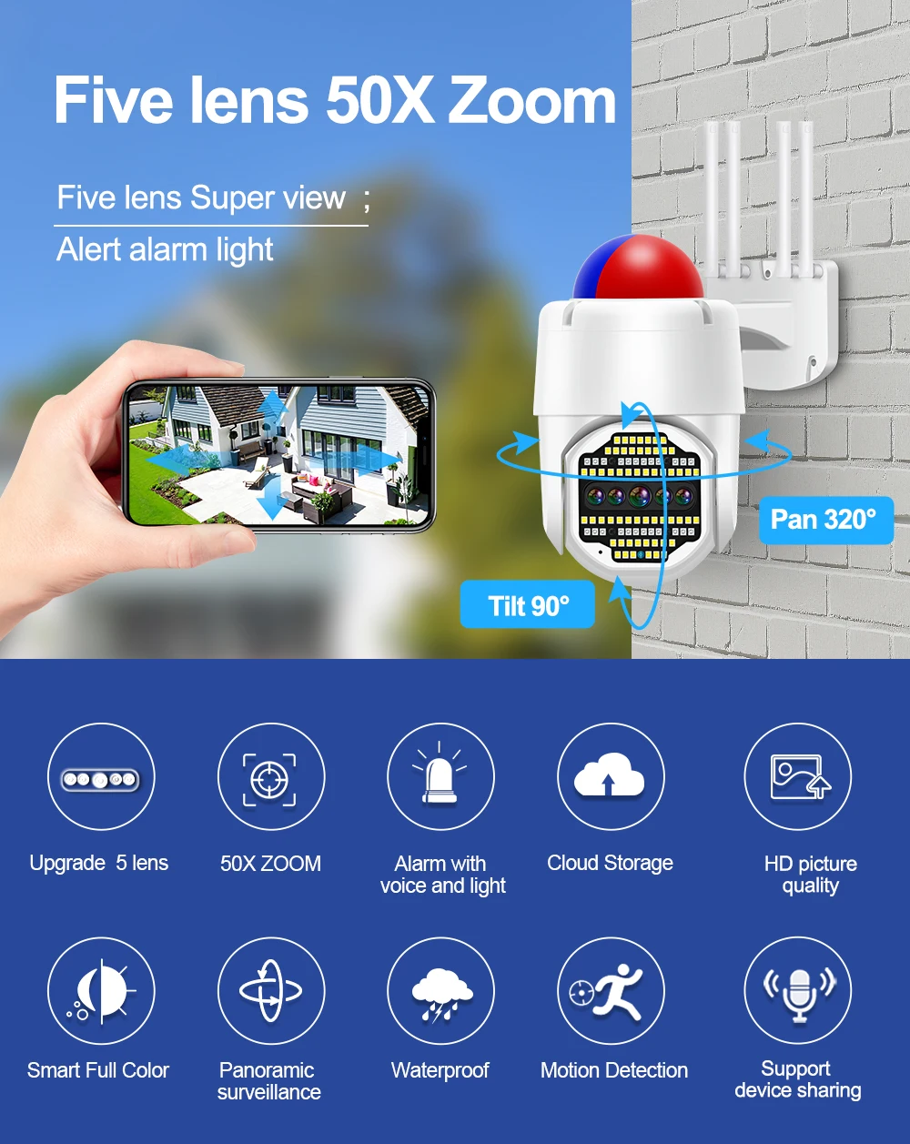 -Наклон панорамирования: горизонтальный: 320 градусов; Вертикальный: 90 градусов с цифровым зумом 50X