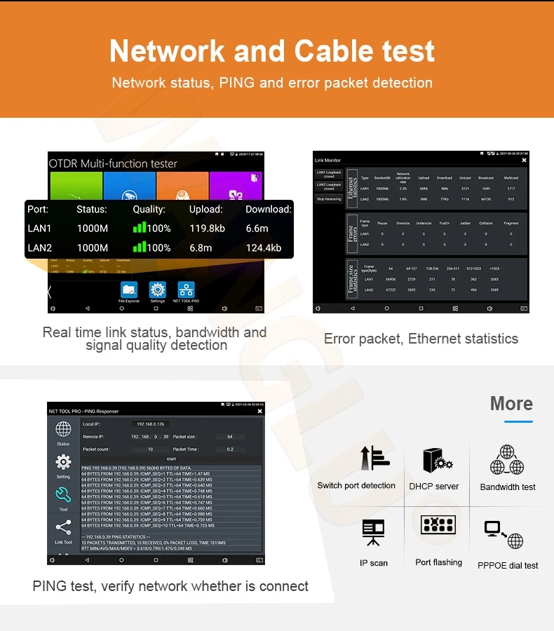 ● Тестер улучшенного кабеля, UTP кабель, телефонный кабель и т. Д.НепрерывностьТест, сохранить отчет о тестировании.Поддержка обнаружения ближнего, среднего и дальнего места неисправности разъема кабеля RJ45