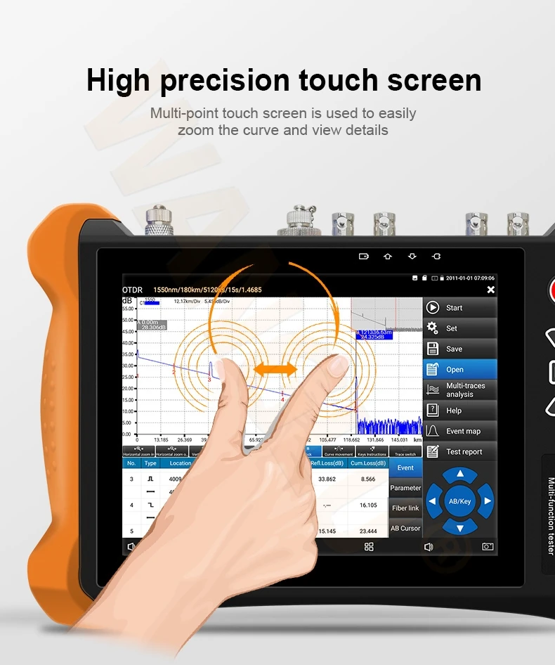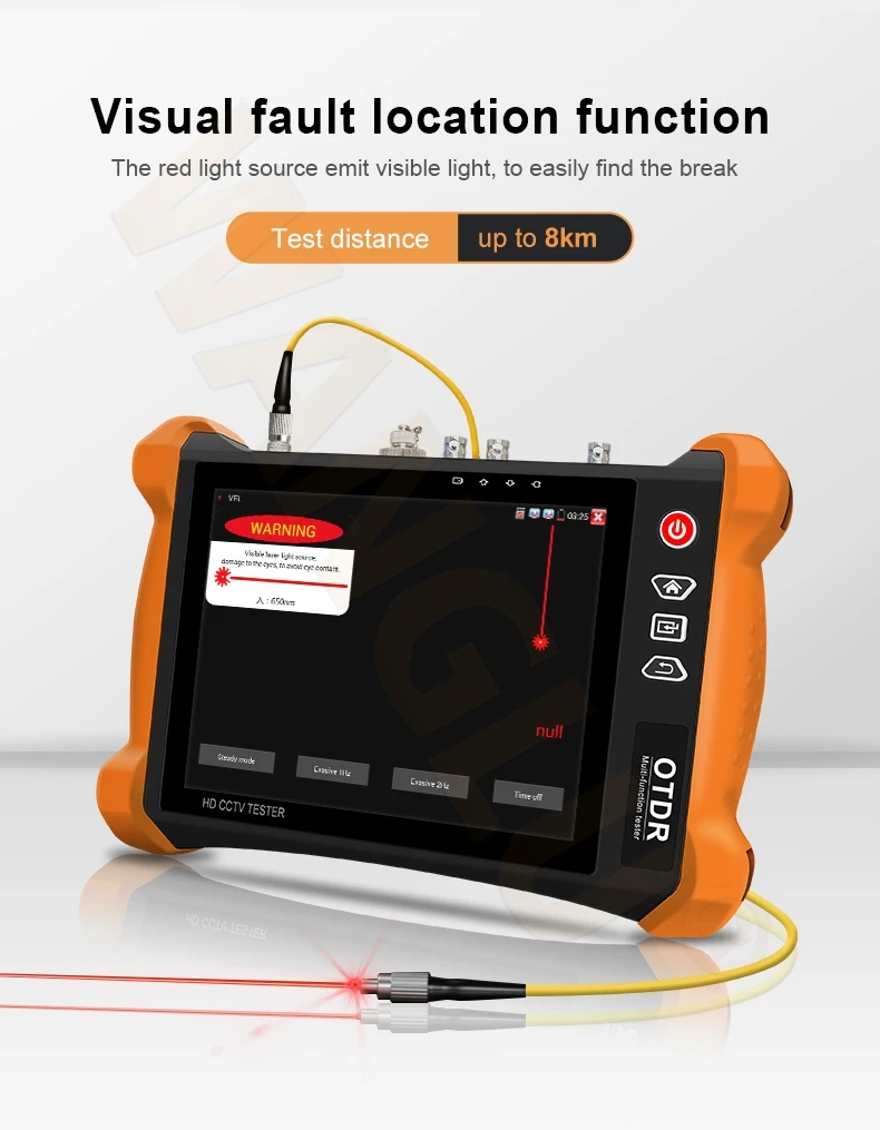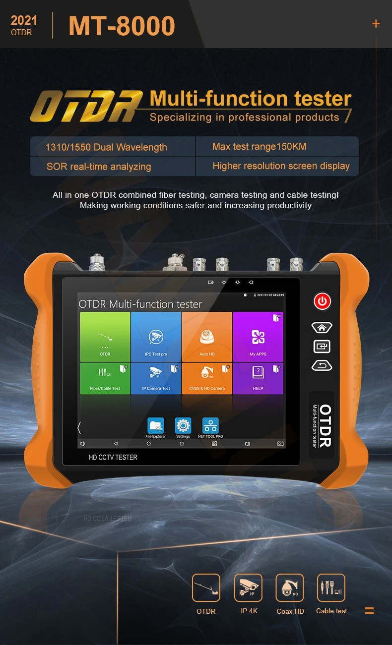 MT-8000: IP + аналог + AHD + CVI + TVI Тест камеры + 4K HDMI вход и выход + цифровой кабель tracer + визуальный детектор поломки кабеля + 1310/1550 двойной длины волны, 30/28dB, Диапазон испытаний на 130 км
