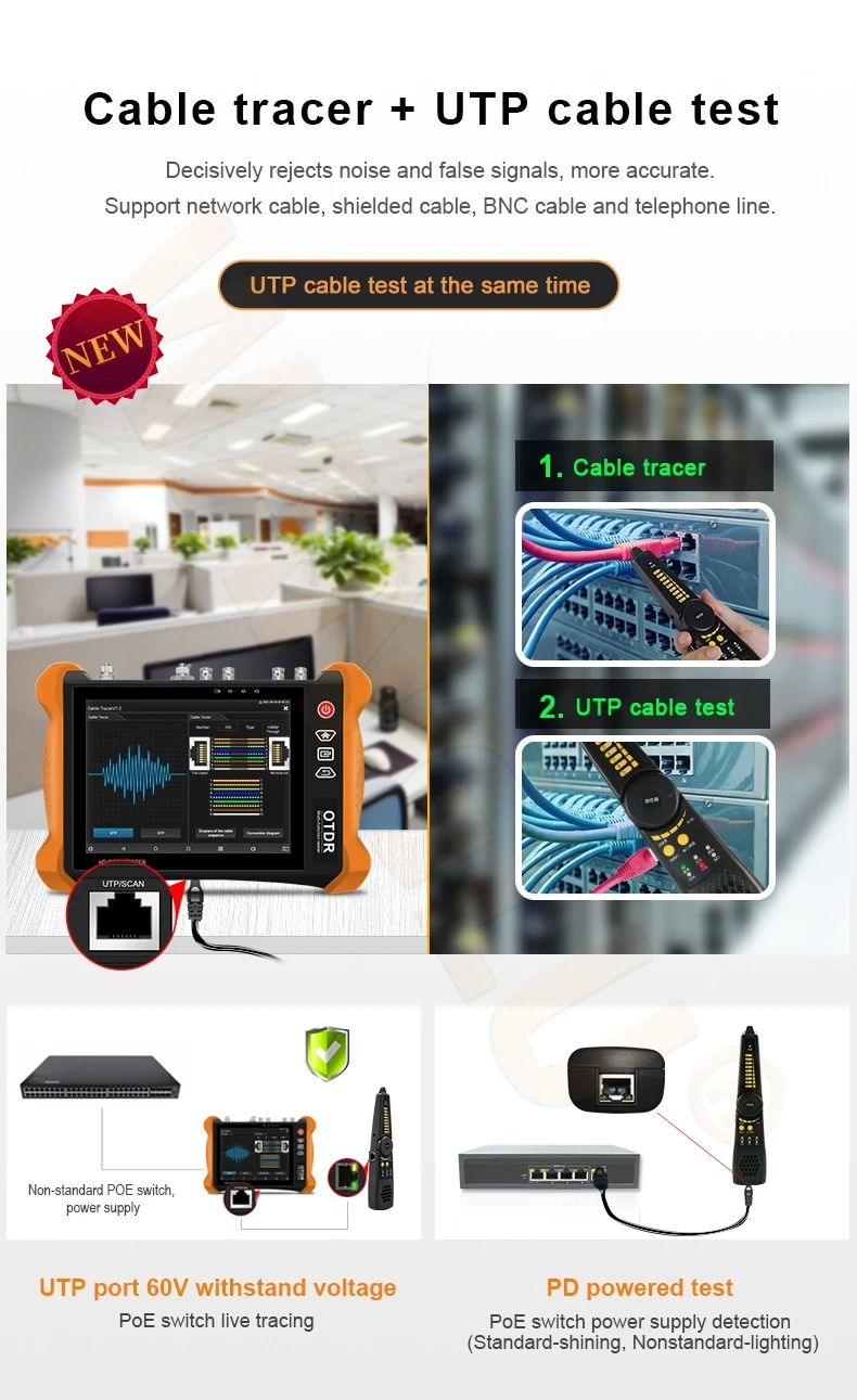 ● Улучшенный тестер кабелей, UTP кабель и т. Д. Тест на непрерывность, обнаружение ближнего, среднего и дальнего места повреждения кабеля RJ45