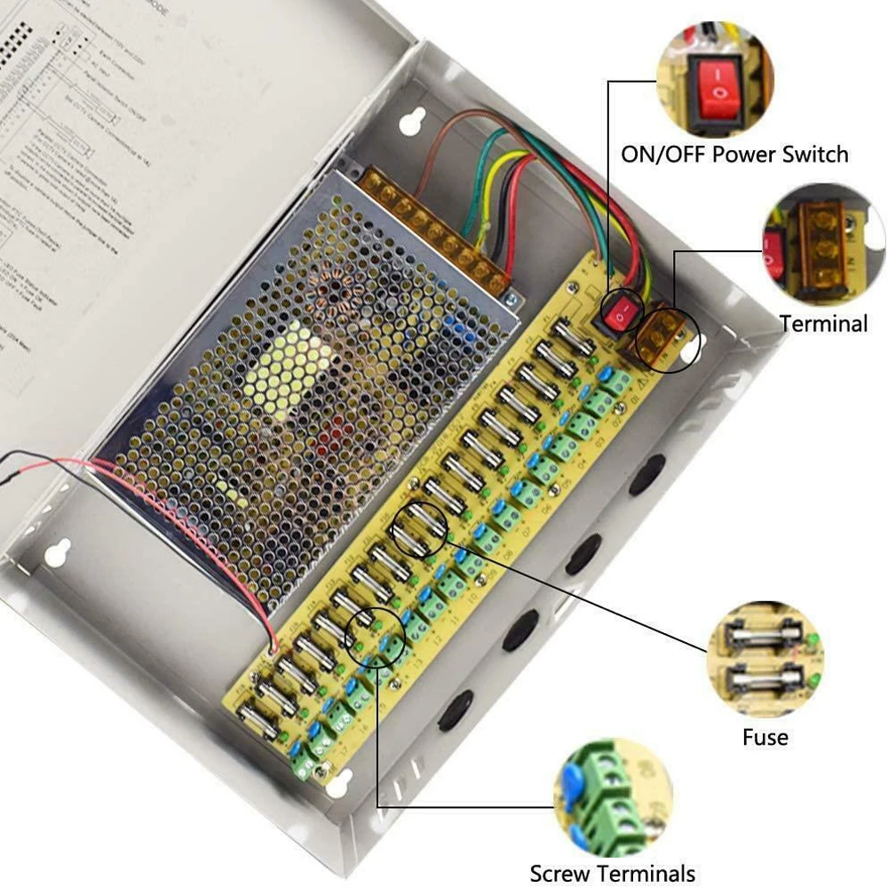Этот источник питания подходит для камеры видеонаблюдения, системы безопасности, светильник, охранника, монитора и т. Д.