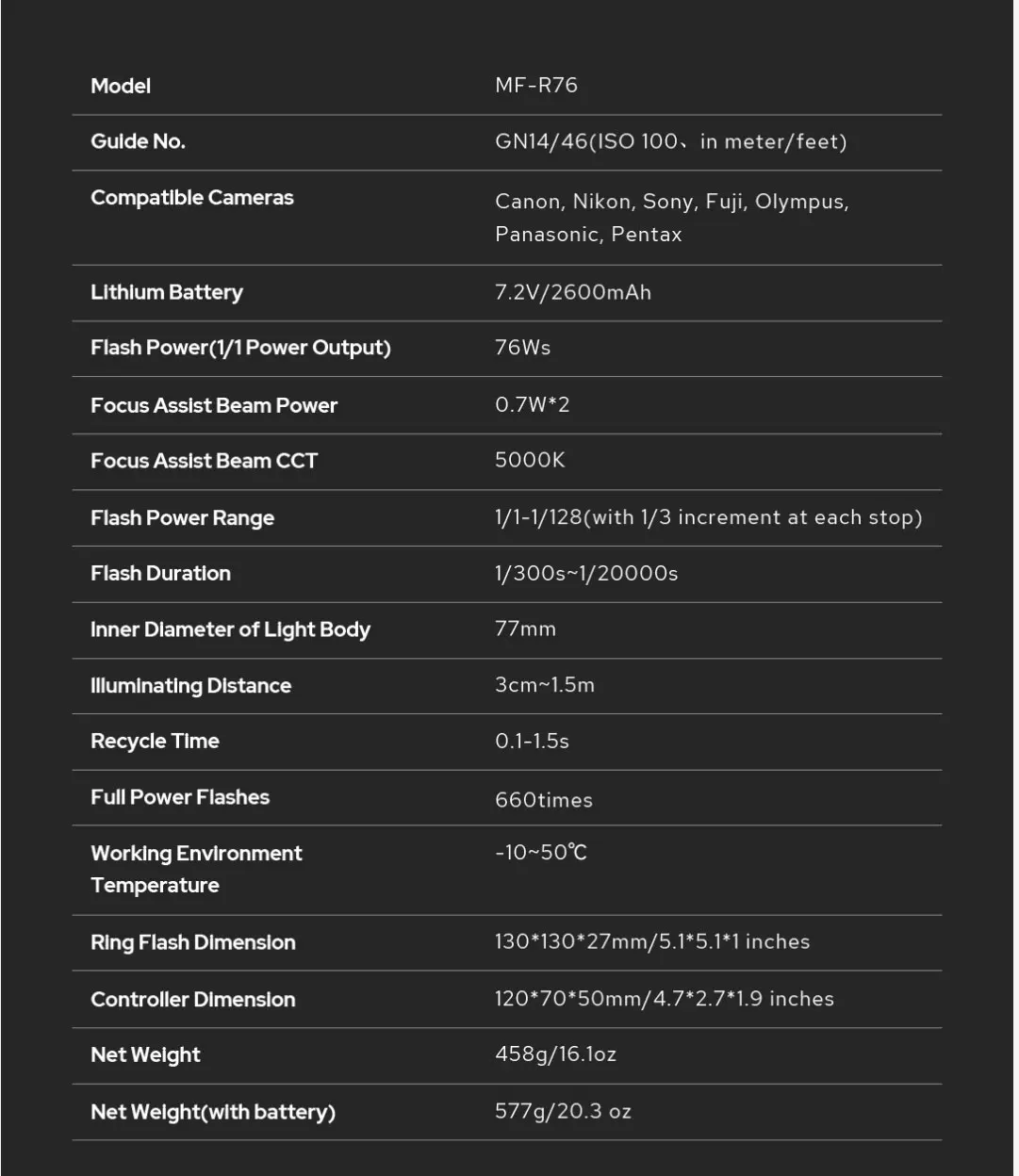 Диапазон мощности вспышки: 1/1-1/128 (с шагом 1/3 на каждой остановке)