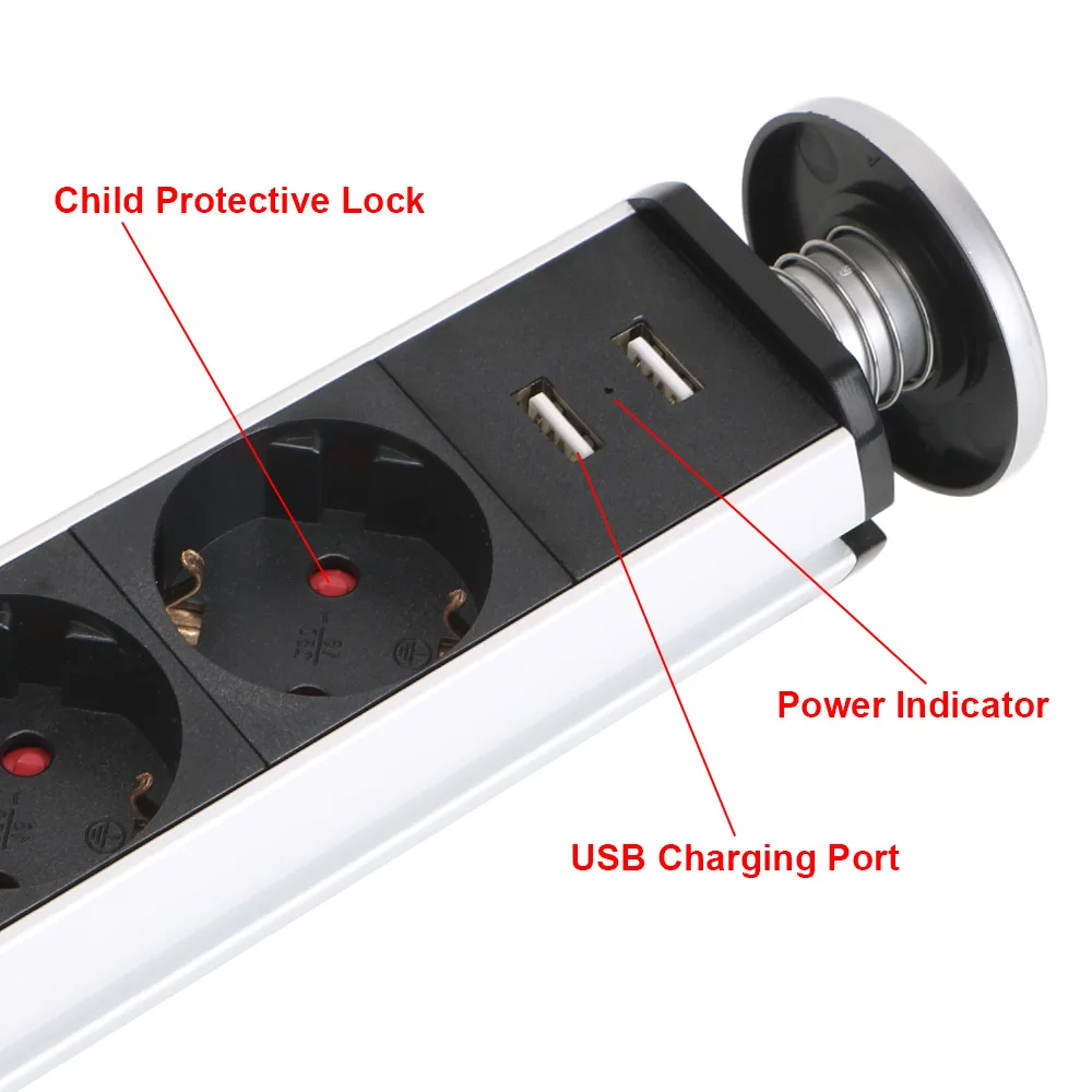 Всплывающее гнездо позволяет подключать до 3 устройств с питанием от сети и заряжать 2 usb-устройства, так что вы можете добавить дополнительные розетки без проблем. С всплывающими режимами, держателем диафрагмы и полным расширением вы можете зафиксировать устройство в своем оптимальном положении.