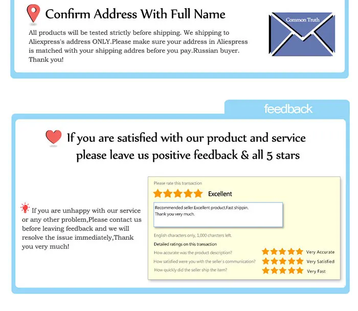 2. Если вы удовлетворены покупкой и нашим общим обслуживанием, ваш комментарий очень важен для успеха нашего бизнеса. Пожалуйста, уделите минуту, чтобы оставить нам положительные отзывы с общим детальным рейтингом продаж 5.