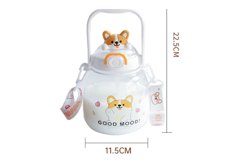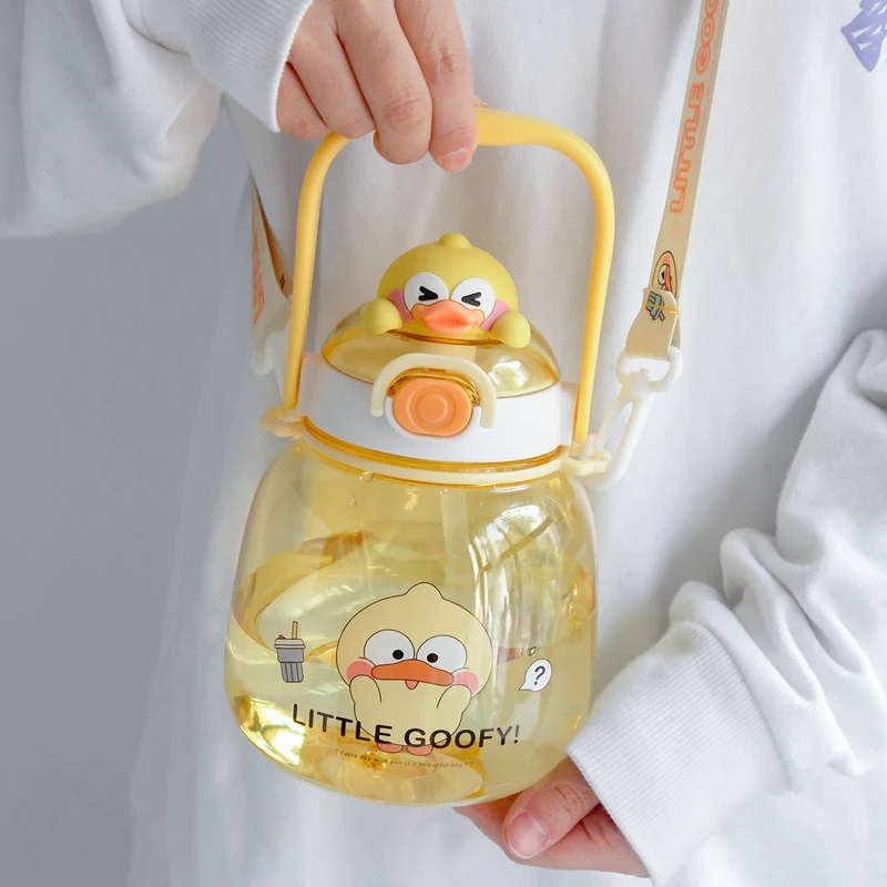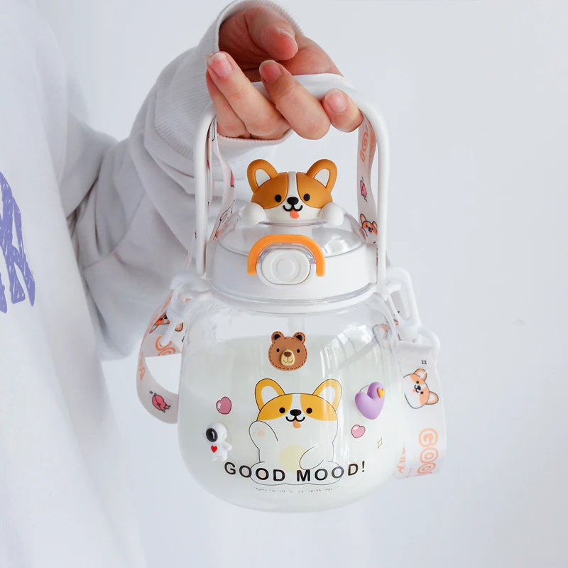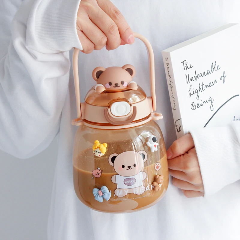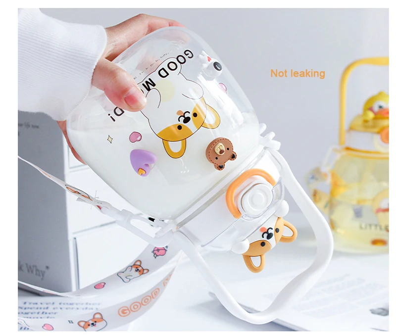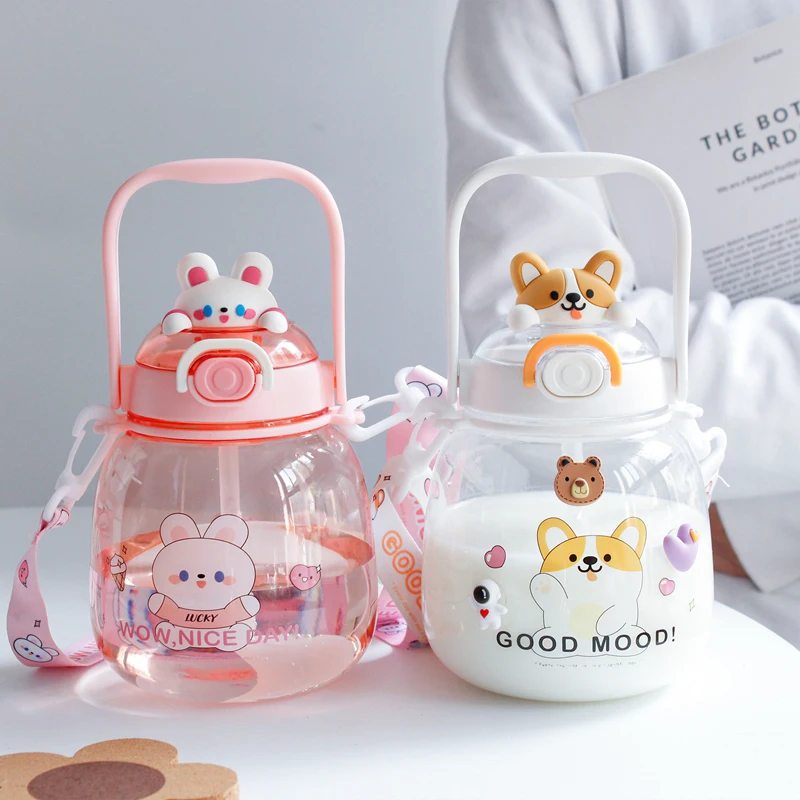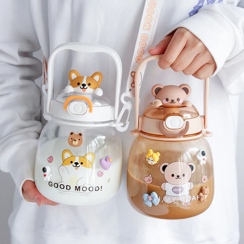 Cute Water Bottle For Girls Kids Kawaii Plastic School Juice Milk Tea Shaker Sport Water Cup With Straw Handle Strap BPA Free