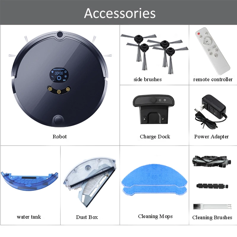 Какая посылка?1x робот-пылесос1x адаптер питания1x Зарядная база1x обновленная коробка для пыли4x обновленная боковая щетка2x тряпка (I pcs rag установлен на резервуаре для воды)1x средняя щетка развертки1x резервуар для воды1x Чистящая Щетка1x Руководство пользователя
