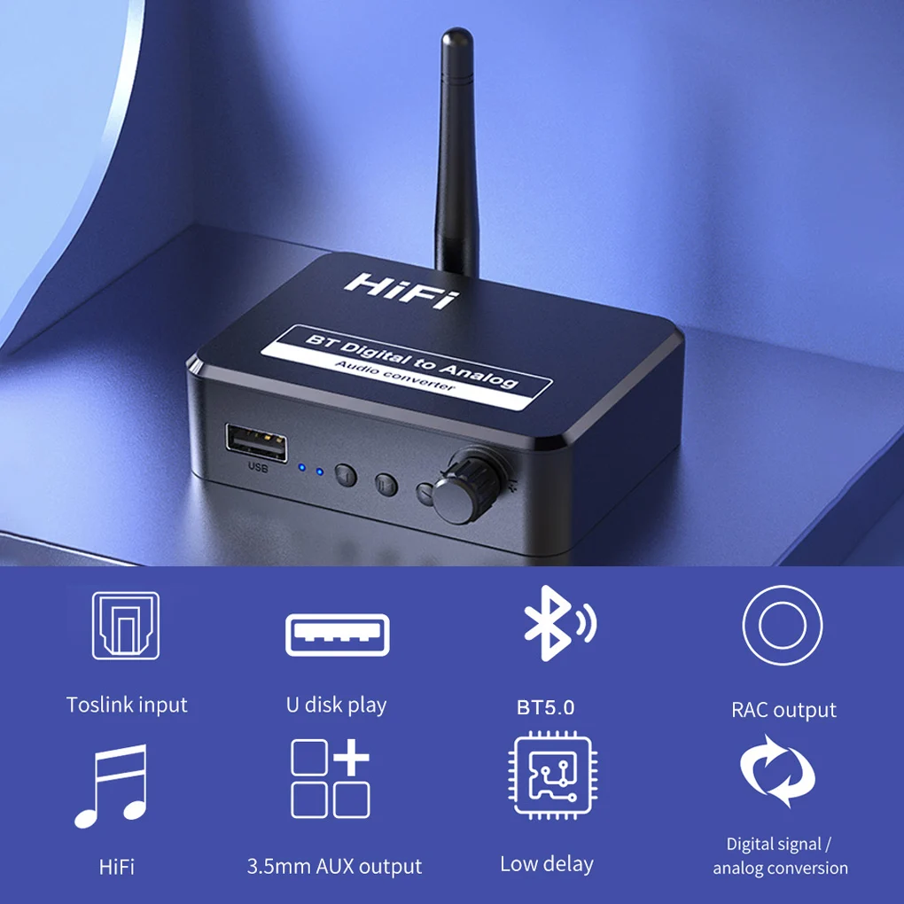 Применение: Этот беспроводной аудиоадаптер может превращать цифровой сигнал в аналоговый сигнал и имеет 3,5 мм, RCA и оптический порт.